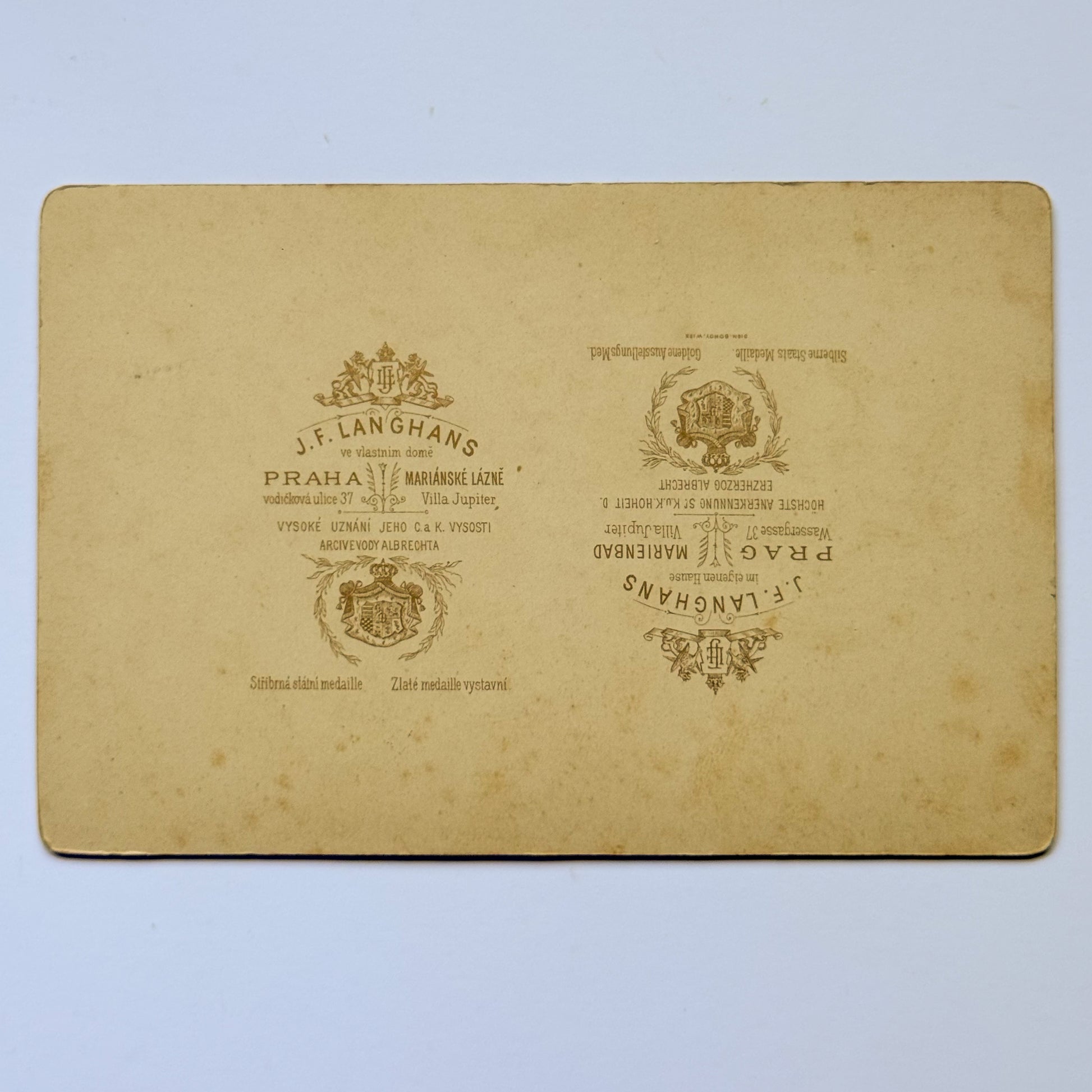 Elegantes Porträt eines jungen Mannes mit gepflegter Frisur und markantem Schnurrbart, aufgenommen von J.F. Langhans , Hoffotograf in Prag und Marienbad .