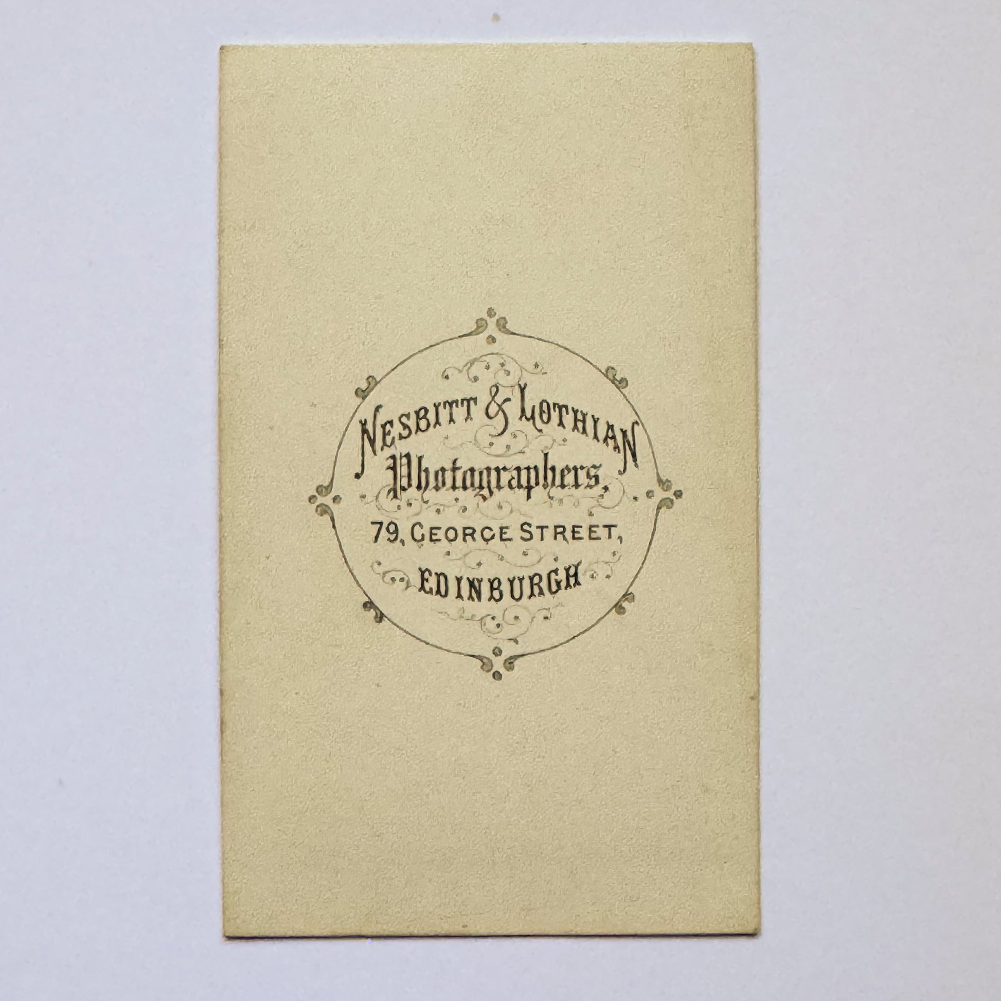 Diese Visitenkarte ist ein schönes Beispiel früher schottischer Atelierarbeit aus der viktorianischen Zeit, die eine Atmosphäre unaufdringlicher Würde und intellektueller Raffinesse ausstrahlte.