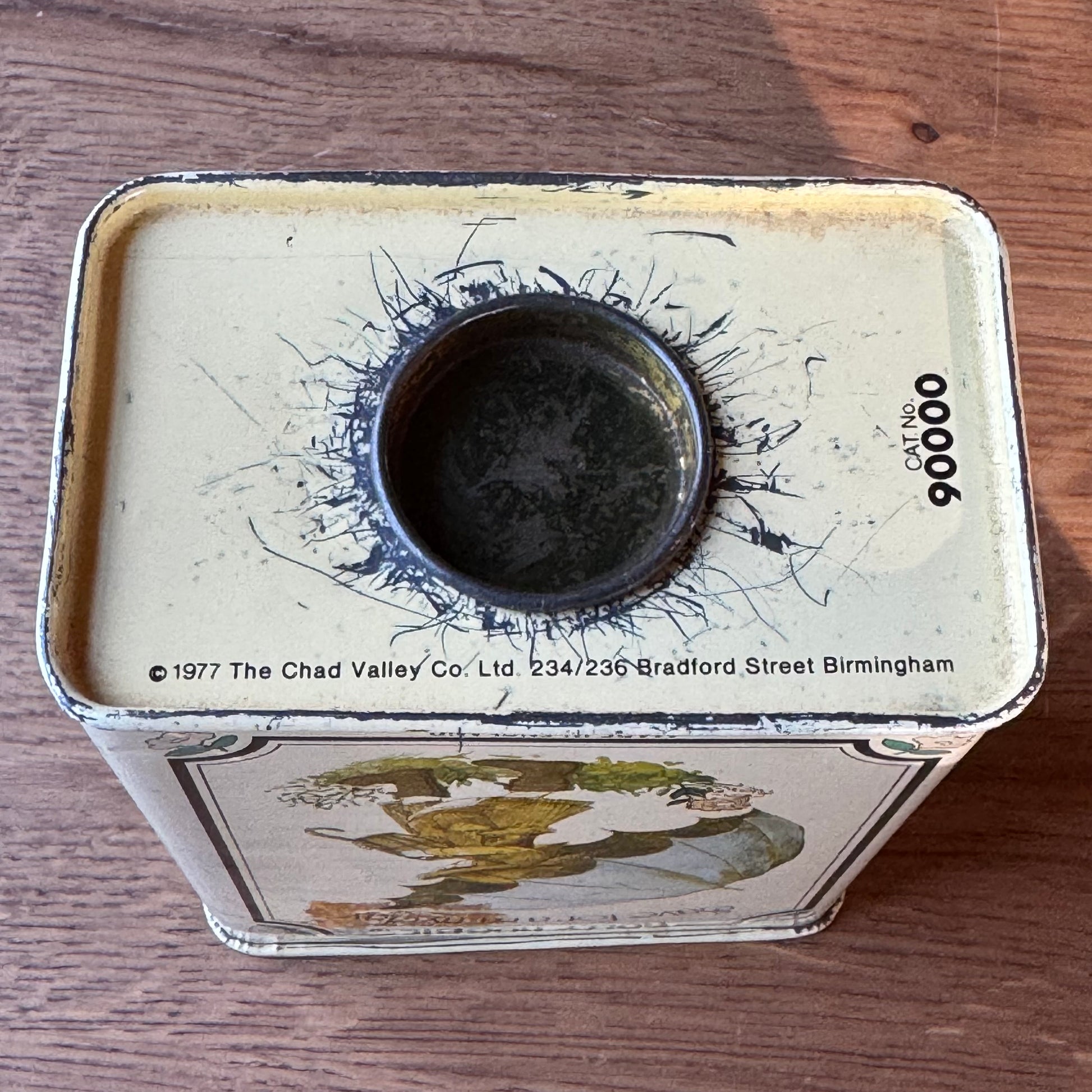 Het blik vertoont duidelijke gebruikssporen passend bij de leeftijd, zoals krasjes, verkleuring, kleine roestplekken en restjes van een oud etiket. De illustraties zijn echter grotendeels goed leesbaar en intact.
