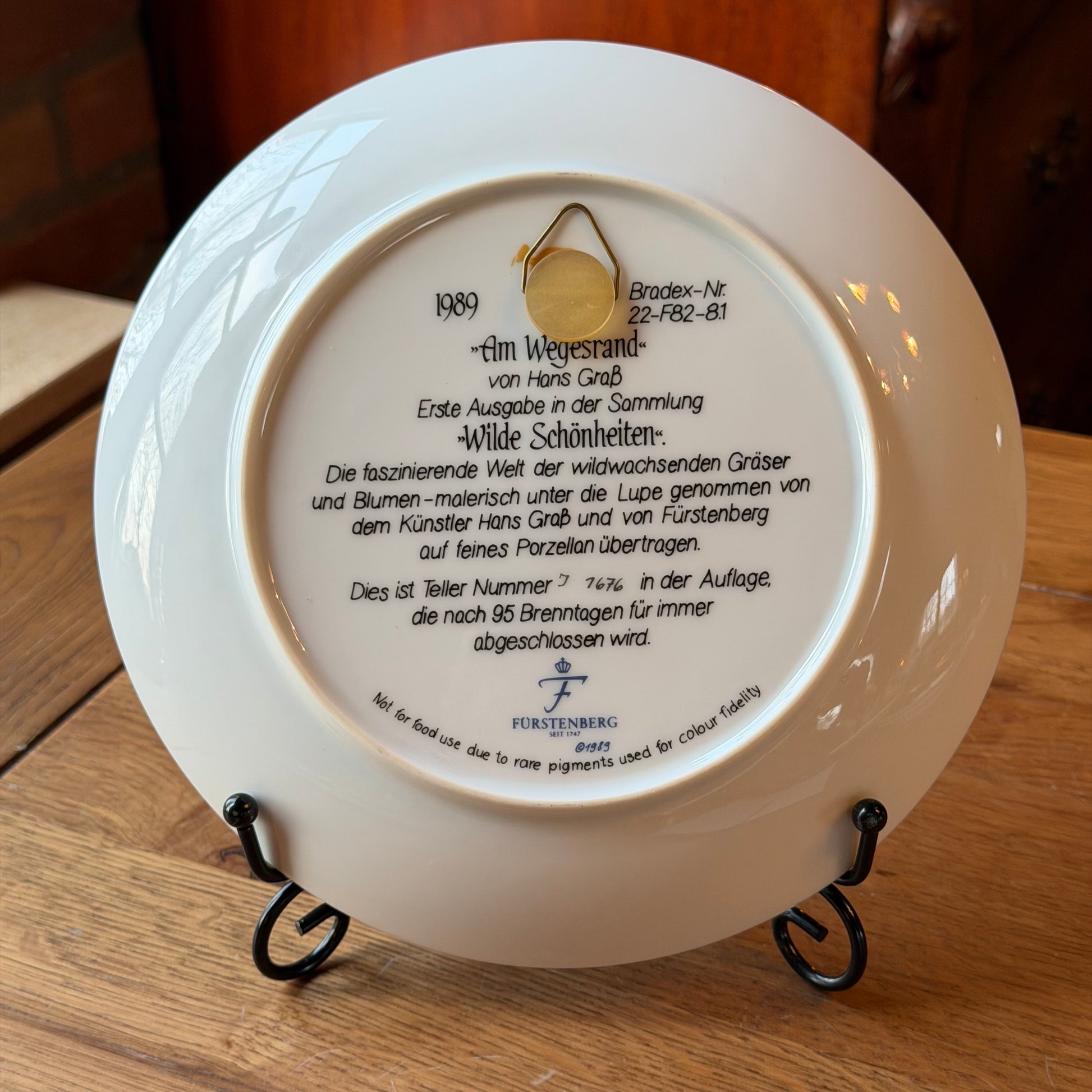 This refined porcelain wall plate, "Am Wegesrand," was designed by Hans Graß and released in 1989 as the first edition in the "Wilde Schönheiten" collection. The plate depicts a rich, botanical scene with wildflowers along a forest edge, executed in a painterly style with exceptional detail and depth of color.