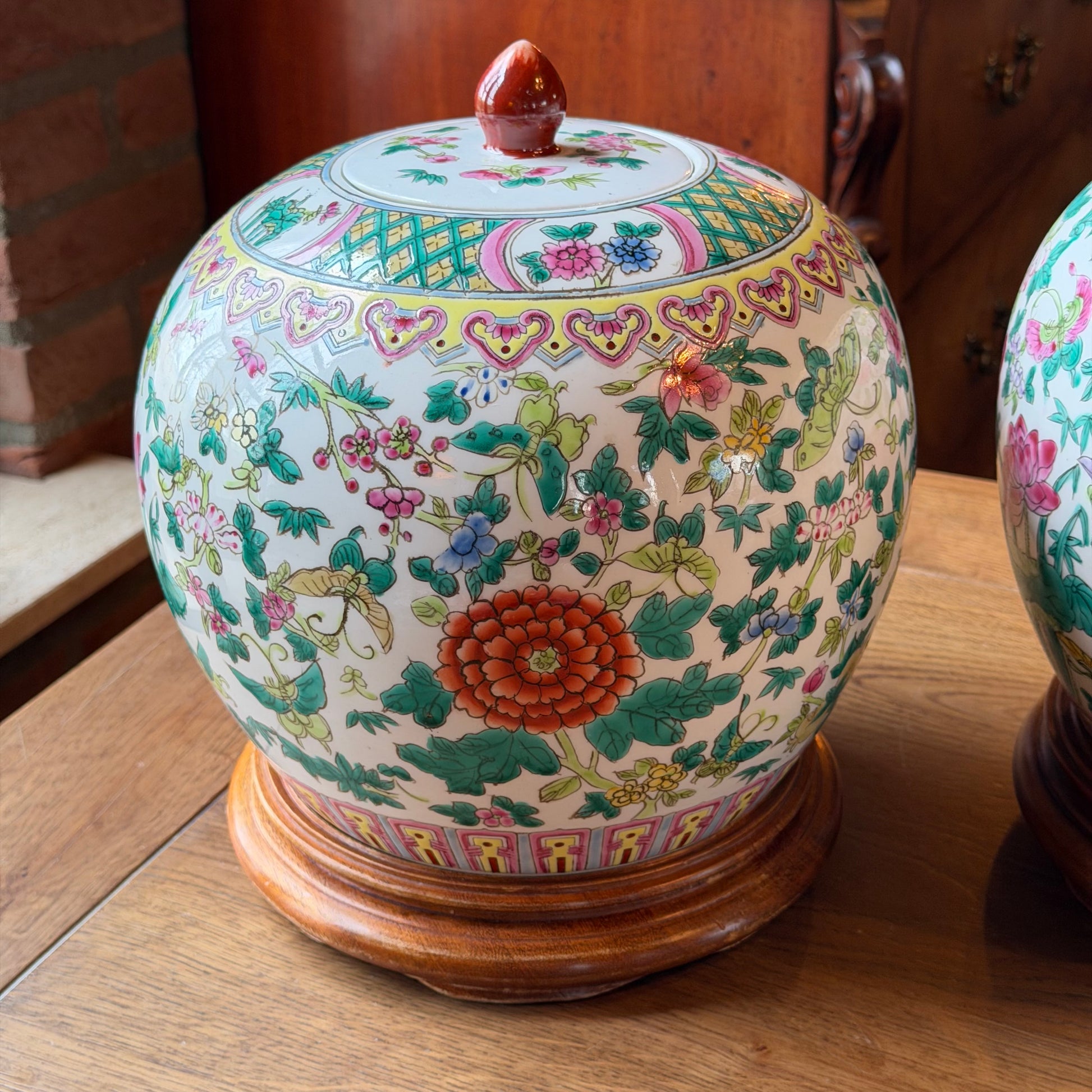 Pair of Vintage Chinese Porcelain Lidded Jars with Flowers & Birds – Famille Rose Style
