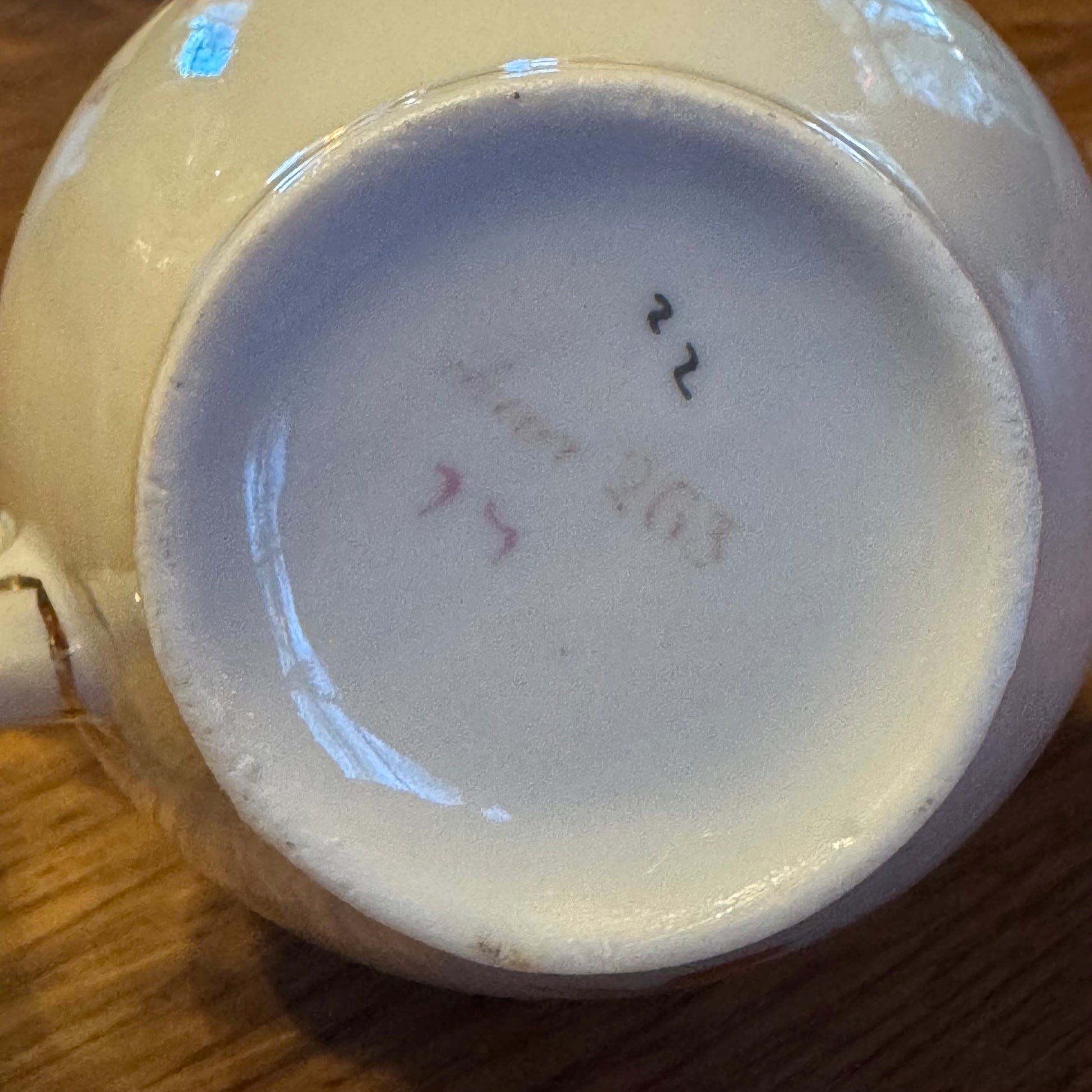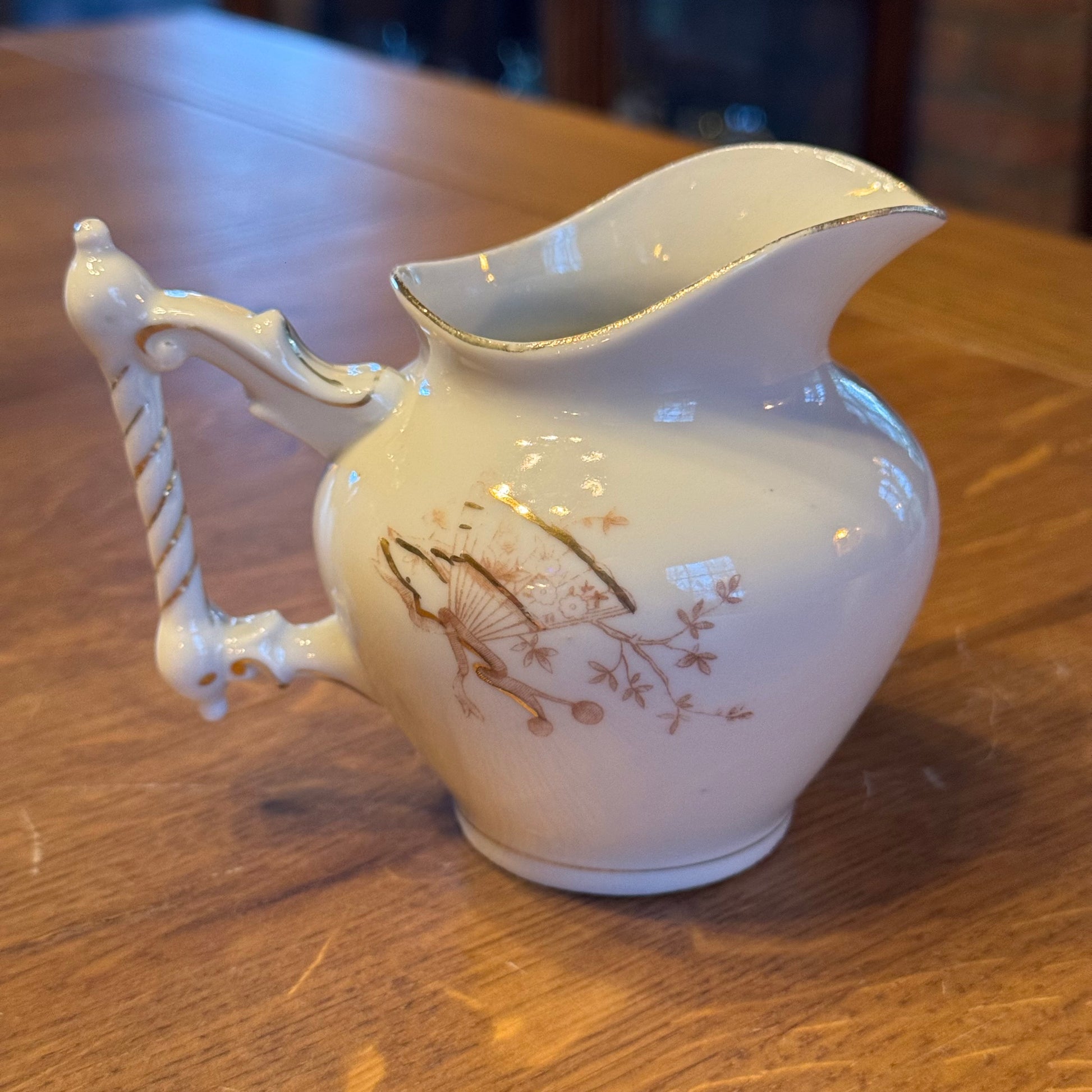 Das Dekor zeichnet sich durch zierliche Zweige, Fächer, Körbe und florale Elemente aus – ein typisches Beispiel für den Japonismus , der um 1900 Europa eroberte. Die anmutigen, gedrehten Griffe und die dezenten Goldakzente verleihen dem Geschirr ein elegantes und raffiniertes Aussehen.