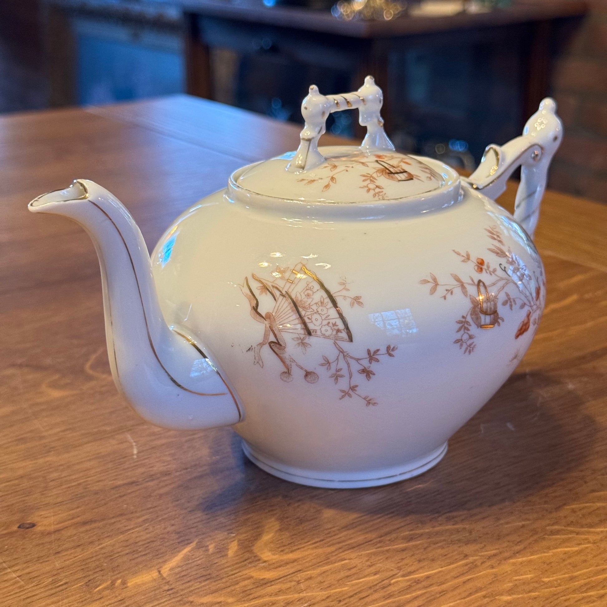 Wunderschönes antikes 4-teiliges Porzellan-Teeservice aus warmem, cremeweißem Porzellan mit rotbraunen japanischen Motiven. Das Service besteht aus: