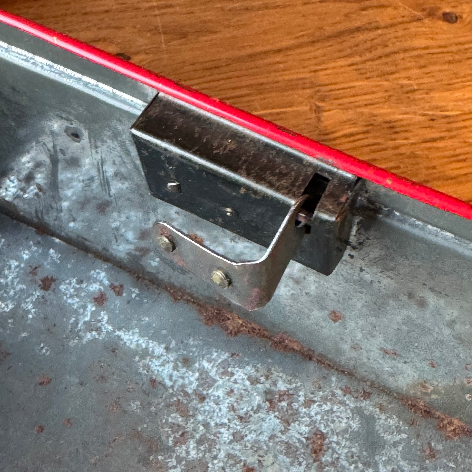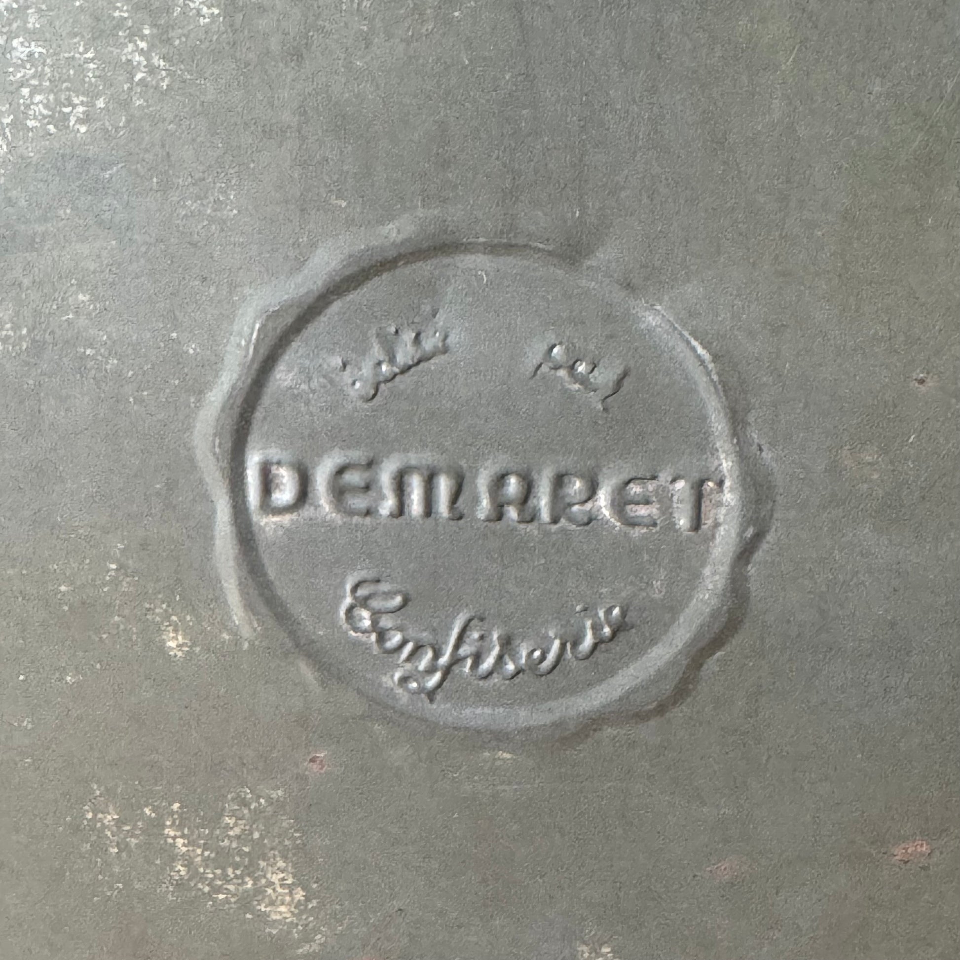 Der Boden ist mit „Demaret Confiserie “ gekennzeichnet, was auf belgische Produktion von Luxuskonfekt Mitte des 20. Jahrhunderts hinweist. Die Dose hat ein Schloss an der Vorderseite (der Schlüssel fehlt). Im Inneren sind deutliche Gebrauchsspuren wie leichter Rost und Abnutzung erkennbar, die auf intensive Nutzung schließen lassen.