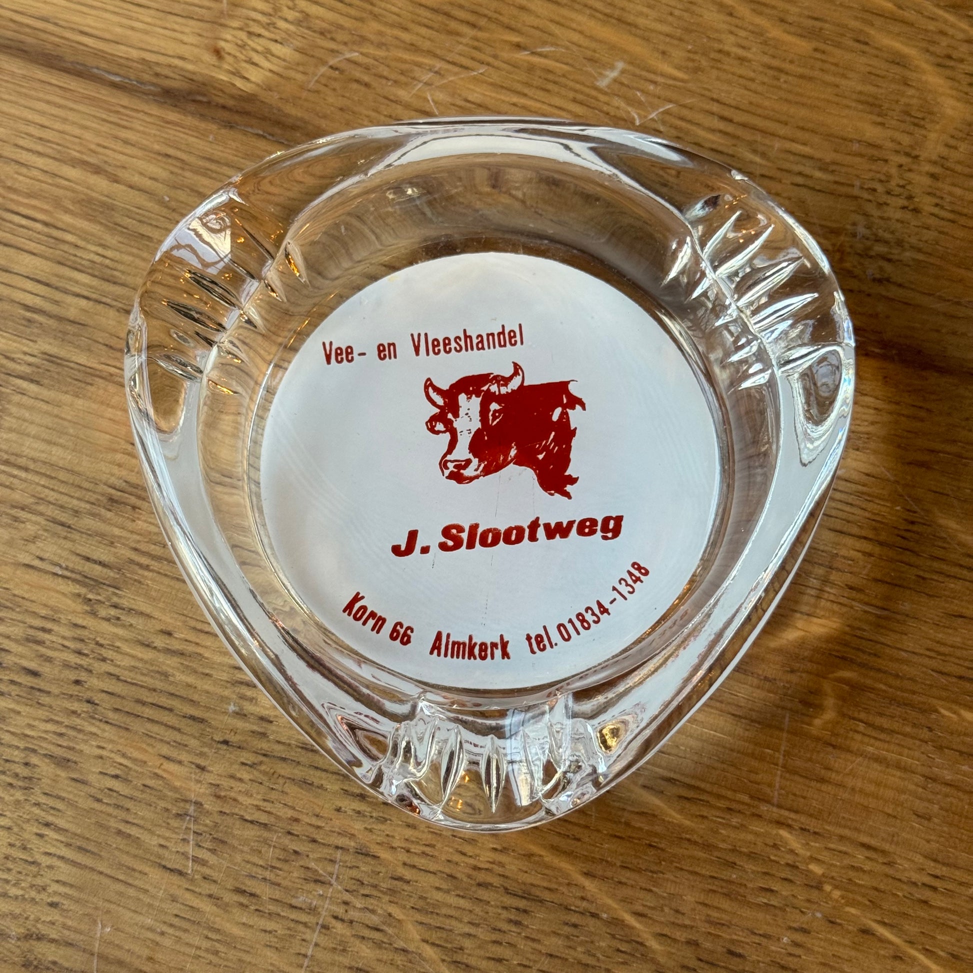 Vintage glazen reclame-asbak J. Slootweg – Vee- en Vleeshandel Almkerk (jaren 70–80)