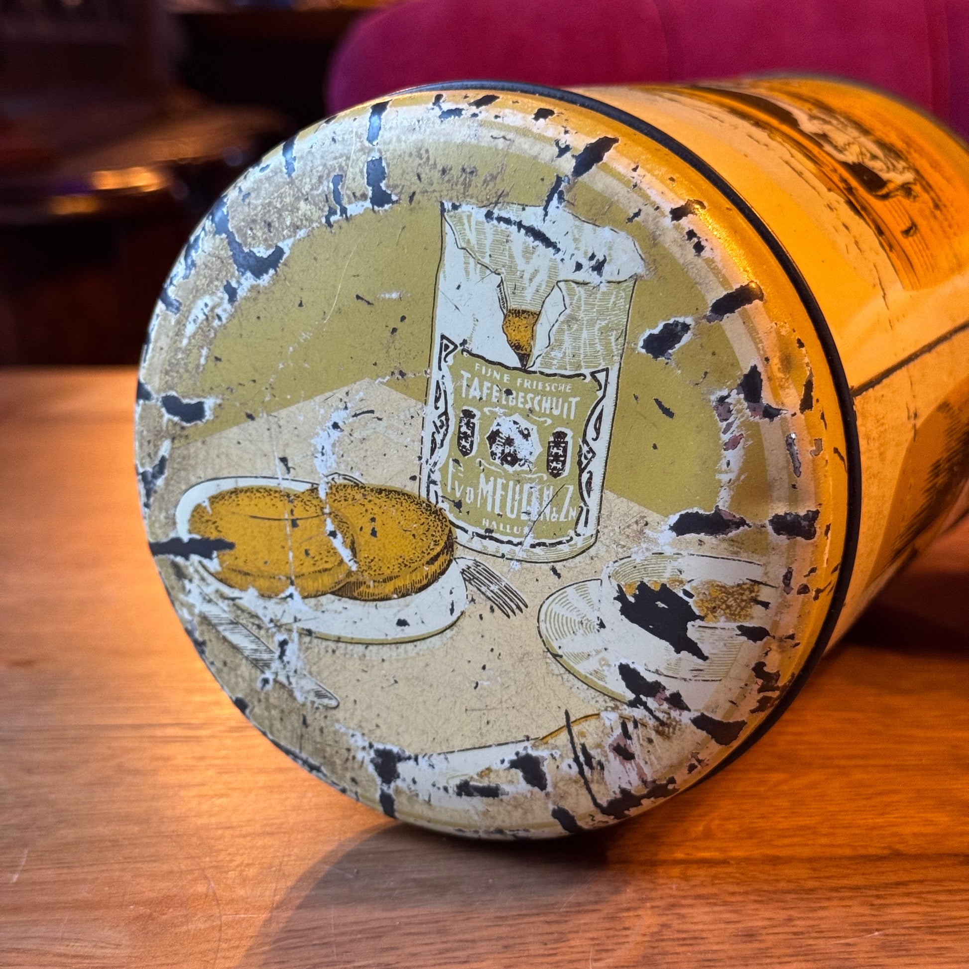 Round rusk tin from Van der Meulen , the Frisian rusk factory in Hallum , known for its distinctive rustic design. The tin features three circular illustrations: a reaper in the grain, a farmer milking a cow, and a poultry scene with chickens and eggs. The lid features the classic logo "Fijne & Frische Tafelbeschuit – vd Meulen – Hallum," a clear reference to its origins.