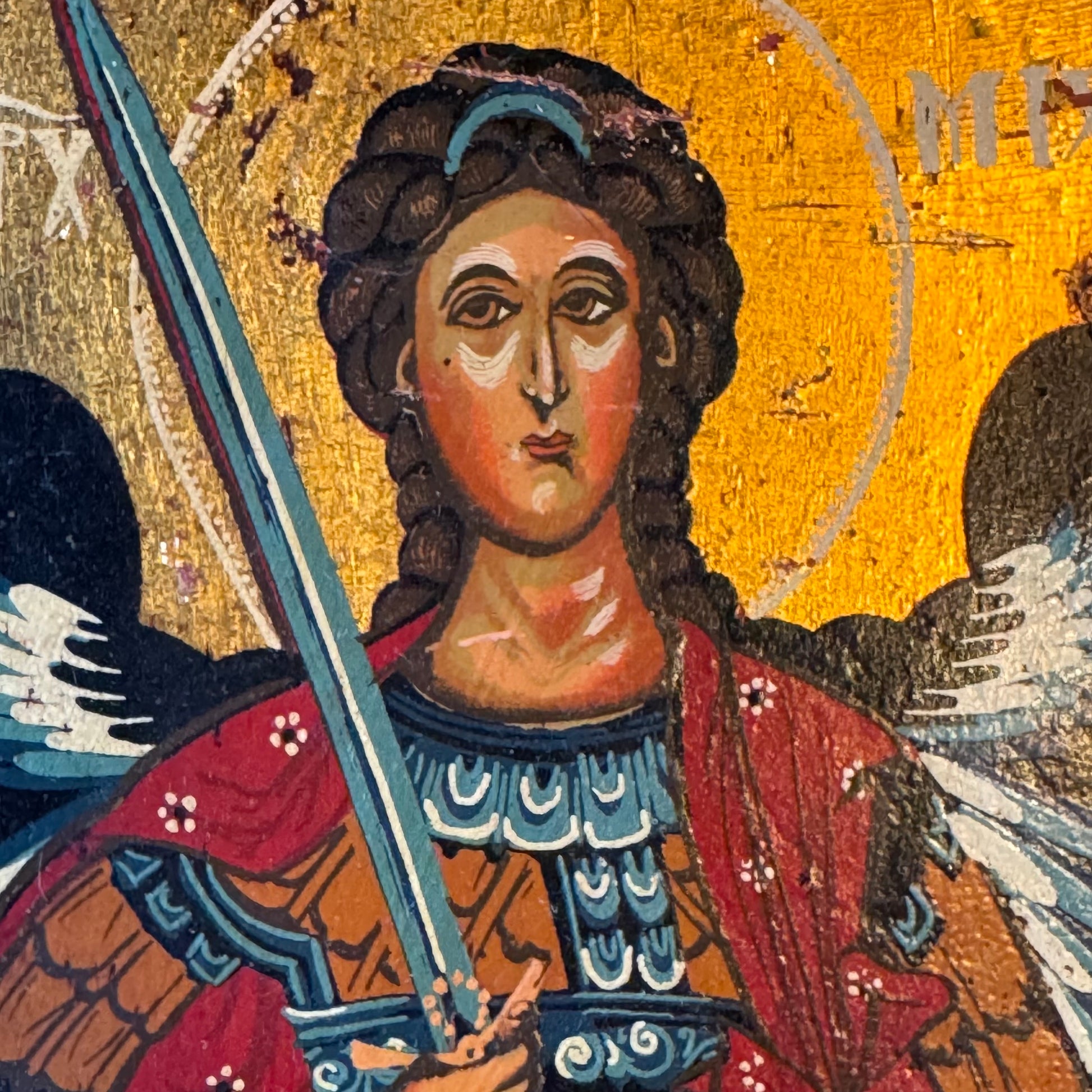 Icon of Archangel Michael with sword on wooden panel