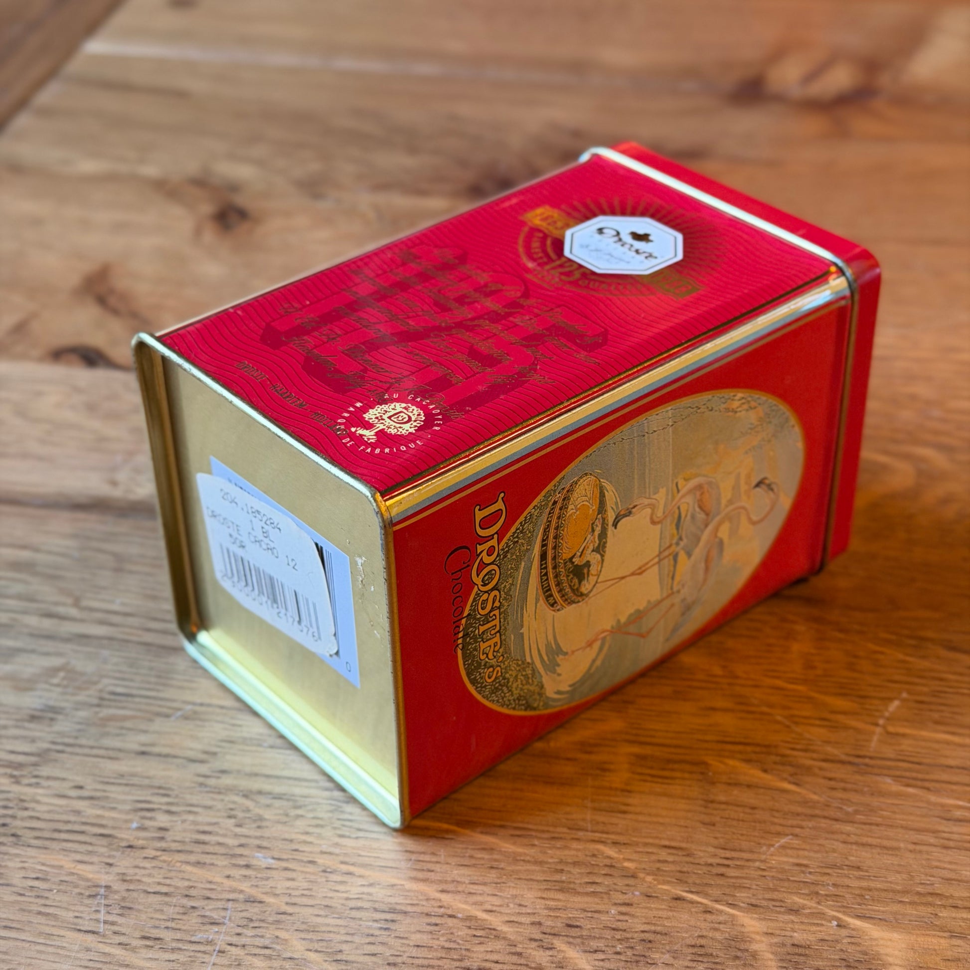 Rectangular metal cocoa tin issued to commemorate Droste's 125th anniversary (1863–1988). The tin is made of red and gold printed tin and features several historical and decorative panels.