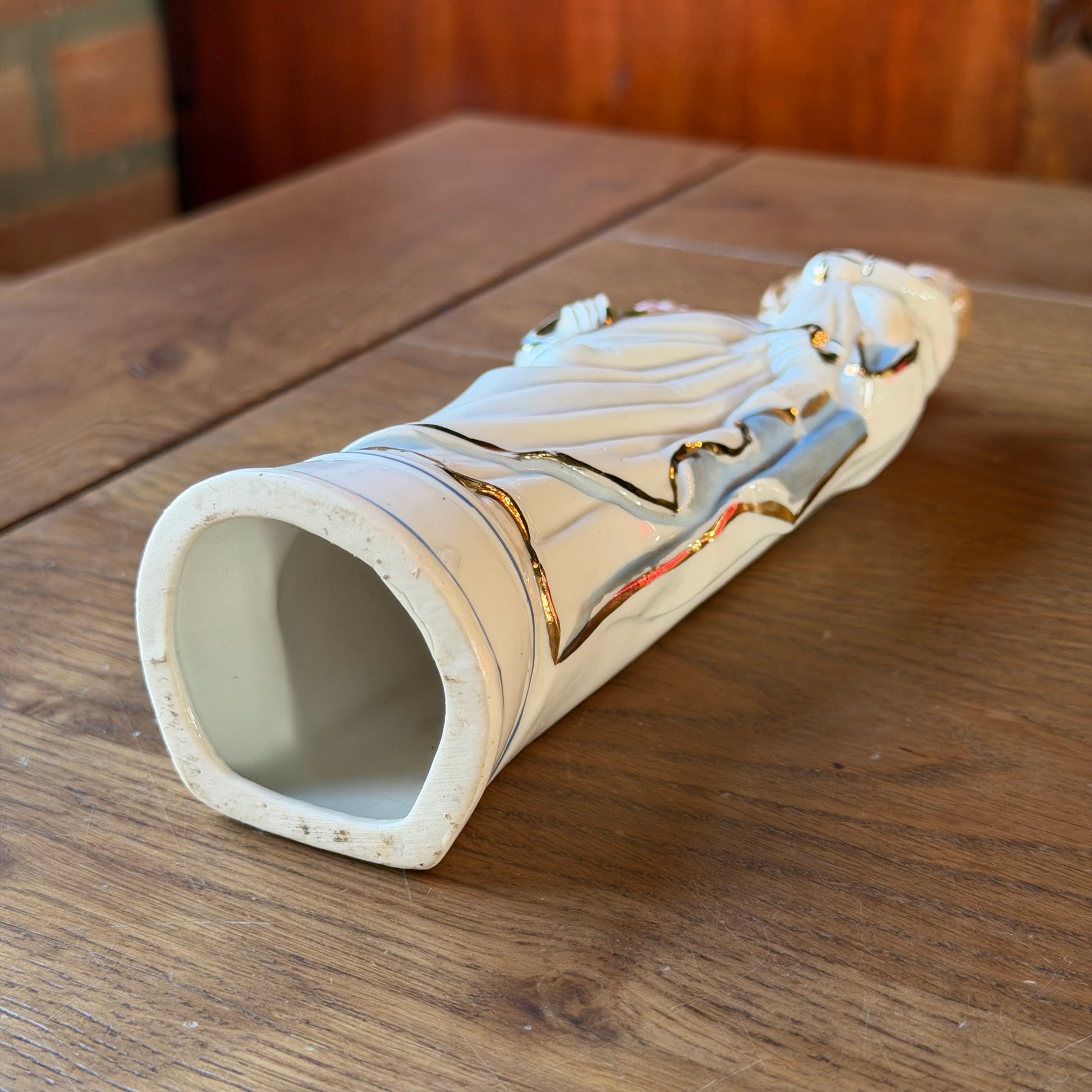 The statue is hollow inside, unglazed on the underside, and hand-painted. Minor wear to the gold is visible and consistent with its age; no cracks or restorations have been observed. An atmospheric object for lovers of religious art, antique porcelain, or tranquil symbolism.