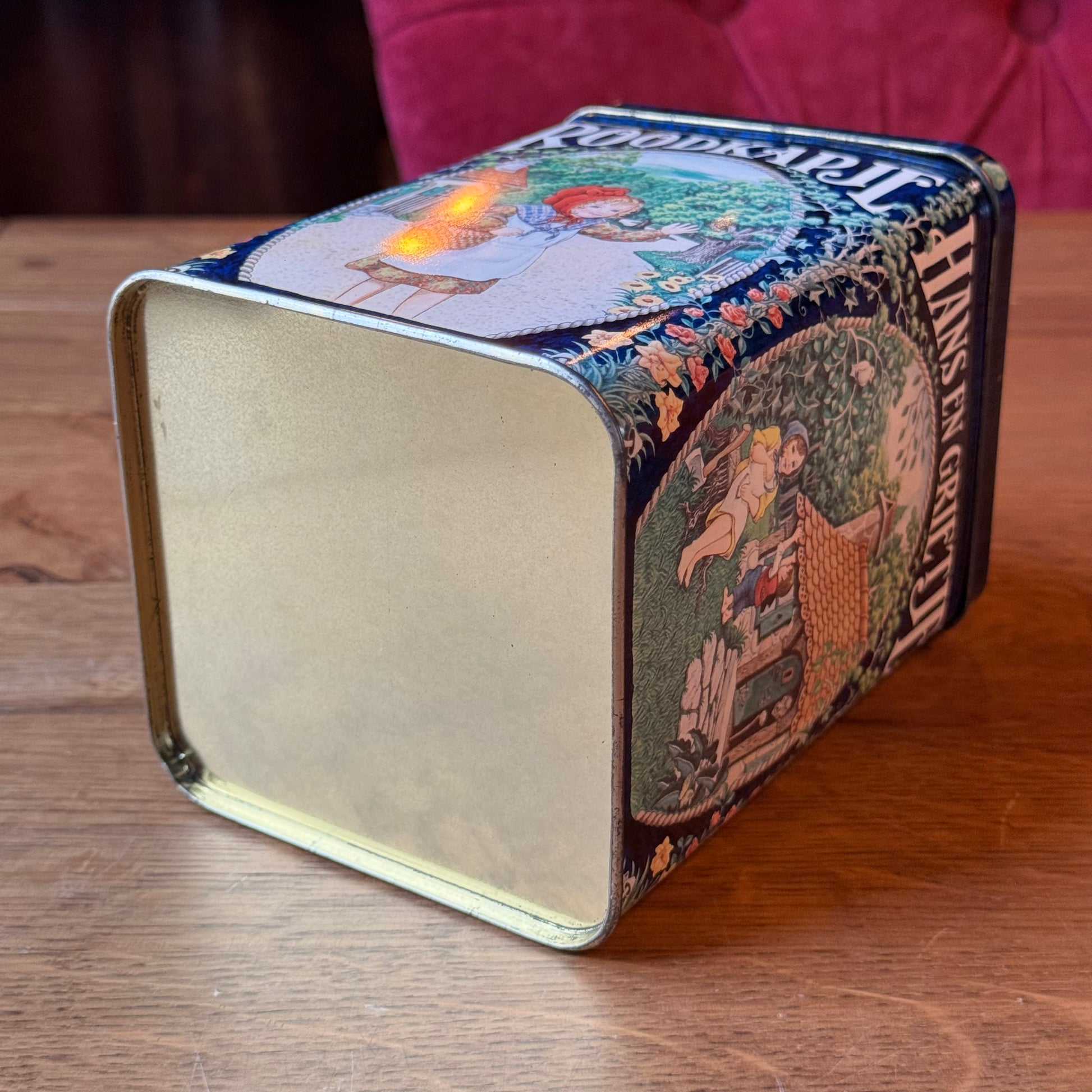 Decoratief metalen sprookjesblik met illustraties van Hans en Grietje, Holle Bolle Gijs, Tafeltje Dekje en Roodkapje. Het blik heeft een diepblauwe achtergrond en kleurrijke prints op alle zijden. Het interieur is goudkleurig en het deksel sluit goed. Aanwezige gebruikssporen: lichte krasjes en enkele kleine beschadigingen aan de randen.
