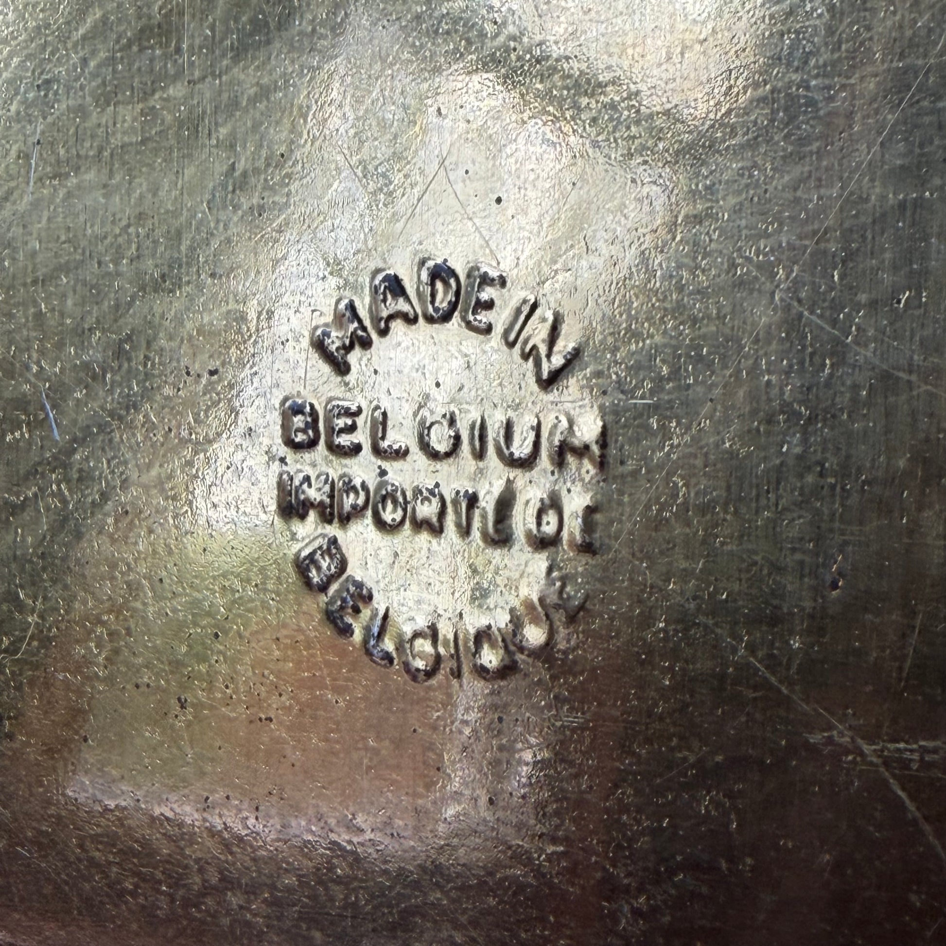 Het blik staat op kleine pootjes, wat het bijna het uiterlijk van een miniatuurkistje geeft. Aan de voorzijde zit een originele sluiting. Binnenin is het blik leeg en toont het een mooie, eerlijke gebruikssporen die passen bij de leeftijd. De stempel aan de binnenzijde vermeldt “Made in Belgium – Importé”, wat wijst op een productie rond het einde van de 19e of het begin van de 20e eeuw.