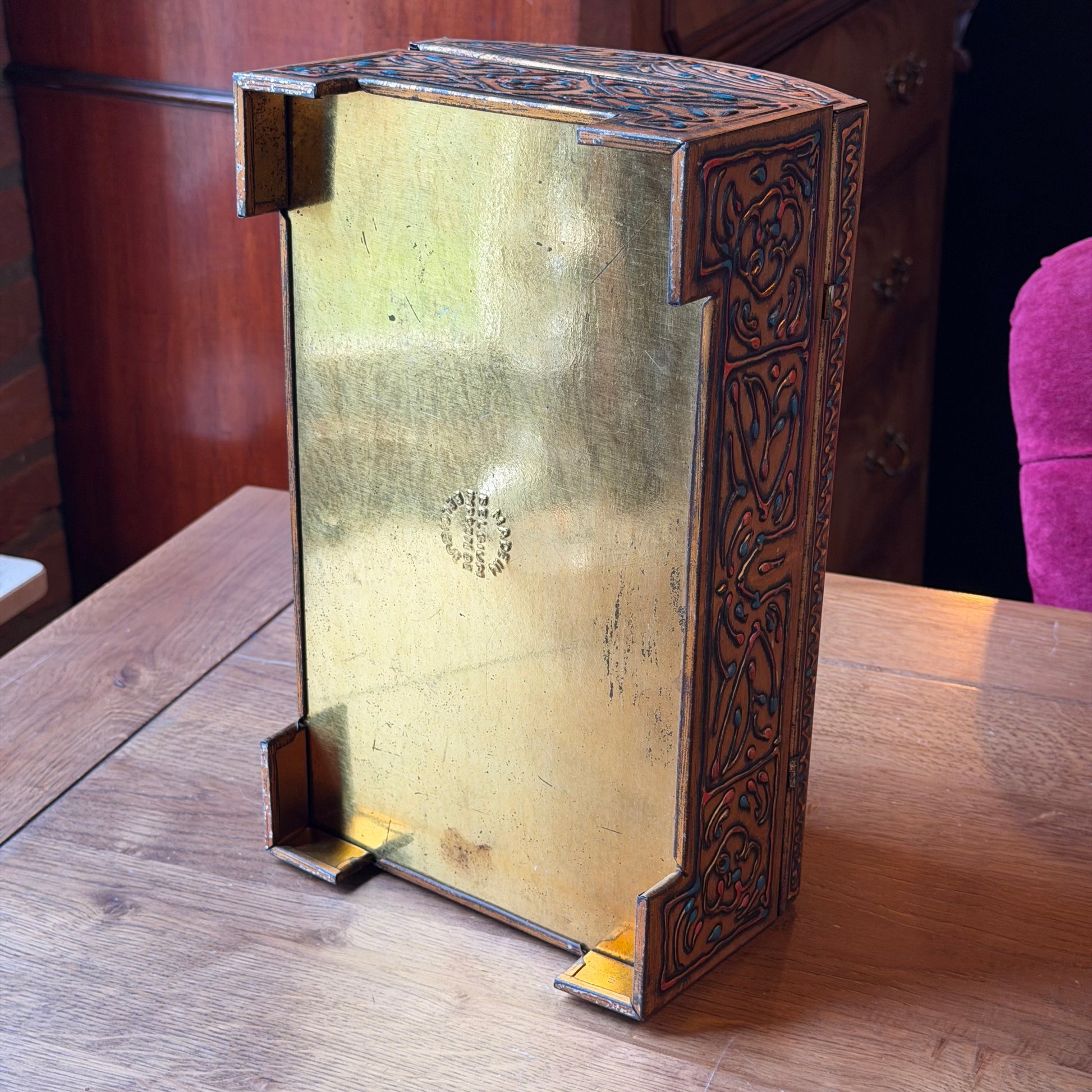Sfeervol blik met een rijk uitgewerkt reliëf en een centrale afbeelding van een Madonna met kind. De deksel is licht gewelfd en rondom voorzien van decoratieve patronen in warme brons- en koperachtige tinten, met subtiele blauwe accenten. In het midden zit een ronde afbeelding in zachte groentinten, die direct de aandacht trekt en het object zijn karakter geeft.