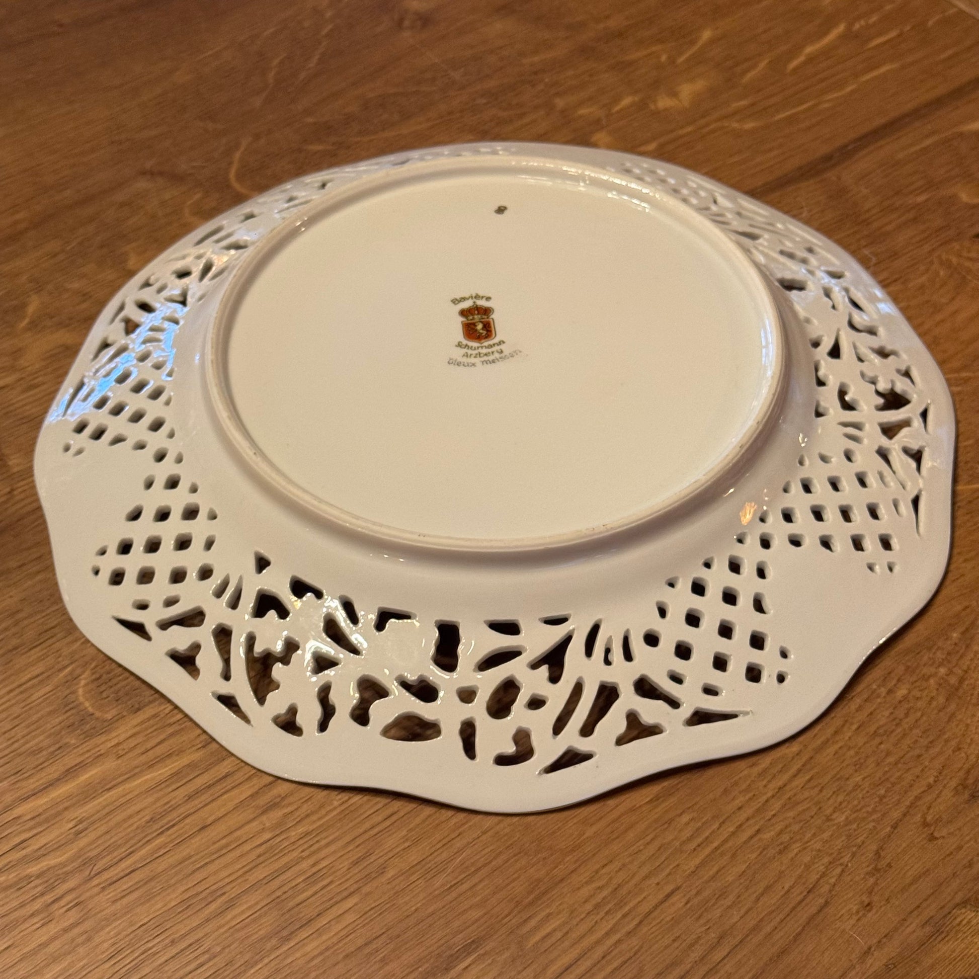 Deze verfijnde duo-set bestaat uit twee rijk gedecoreerde porseleinen borden van het gerenommeerde Duitse huis Schumann Arzberg, uitgevoerd in het geliefde Vieux Meissen-decor. Het ajour- of “pierced” snijwerk langs de rand is volledig met de hand uitgesneden, waarna het bord laag voor laag is beschilderd met kleurrijke bloemen en goudaccenten.