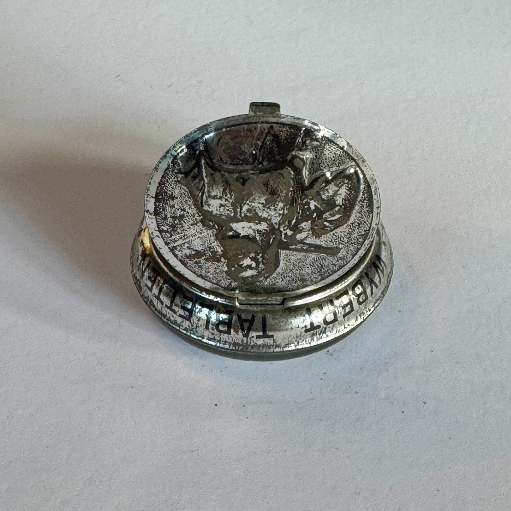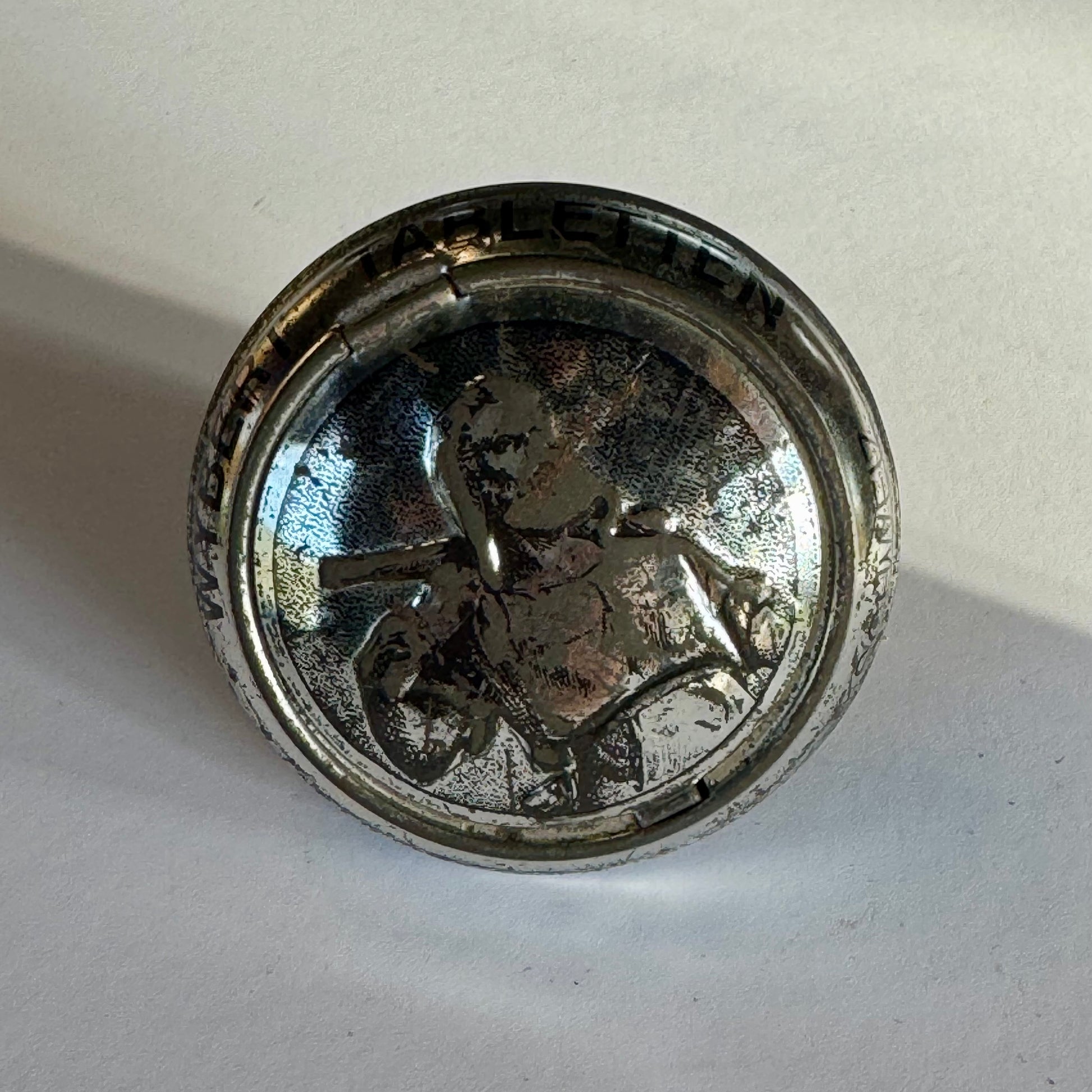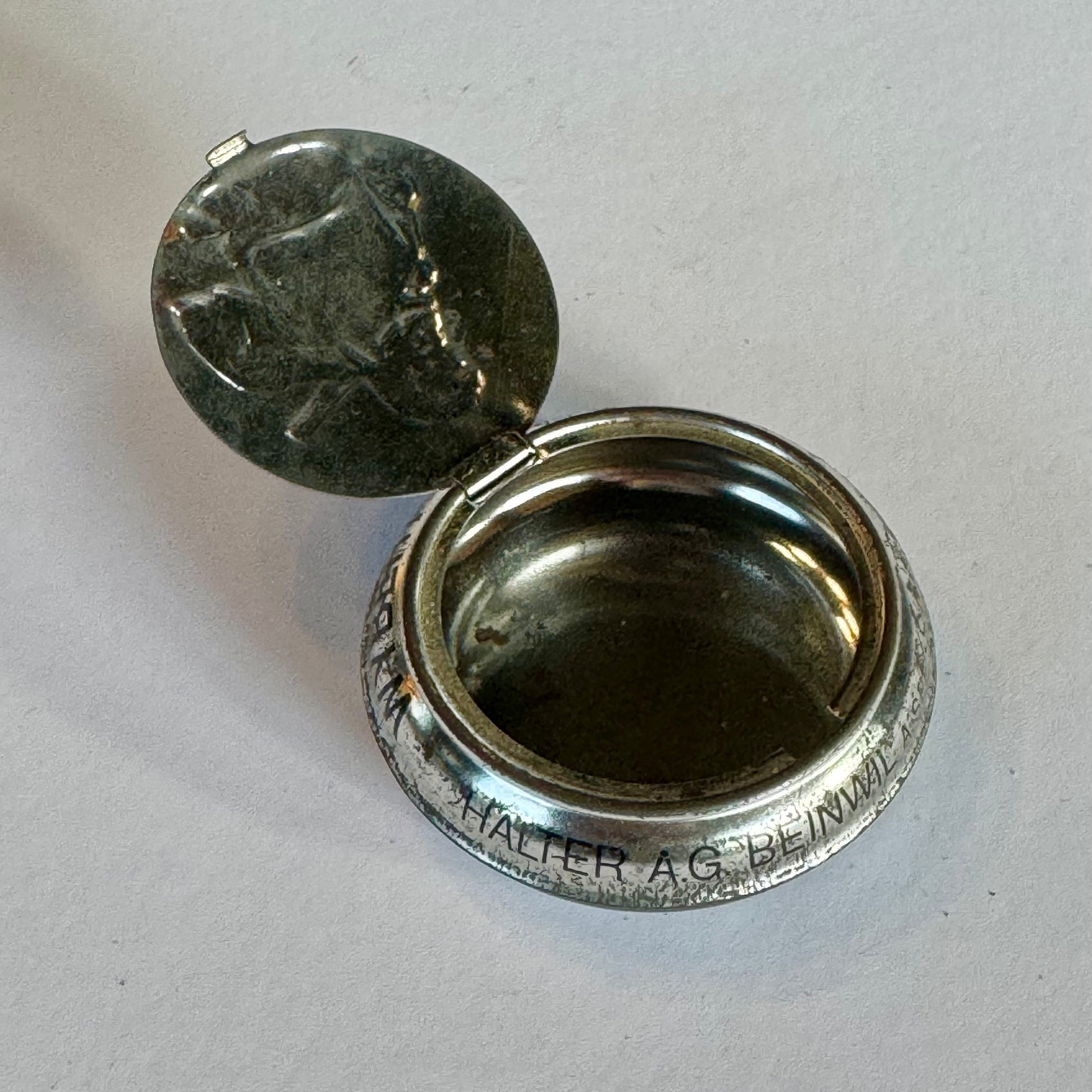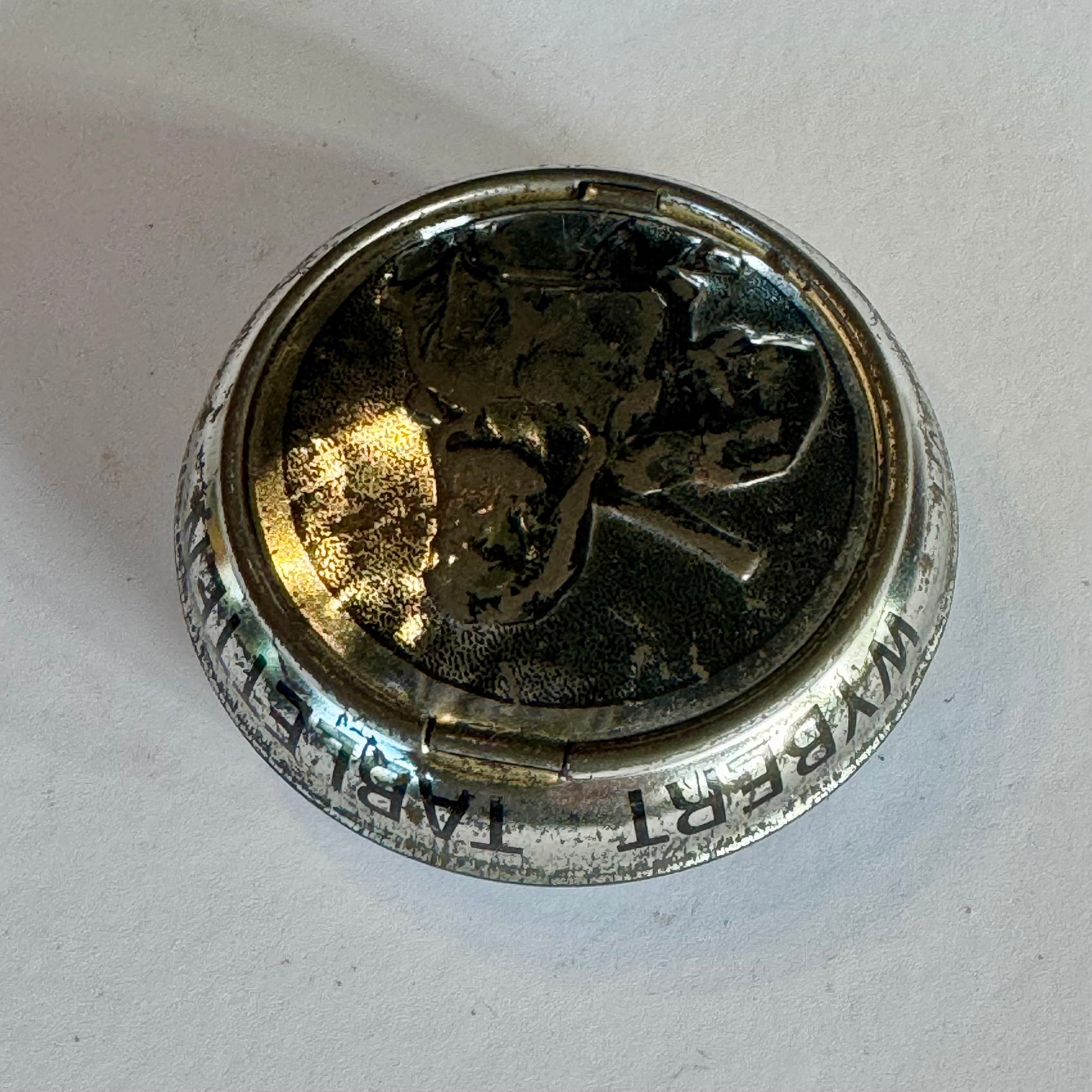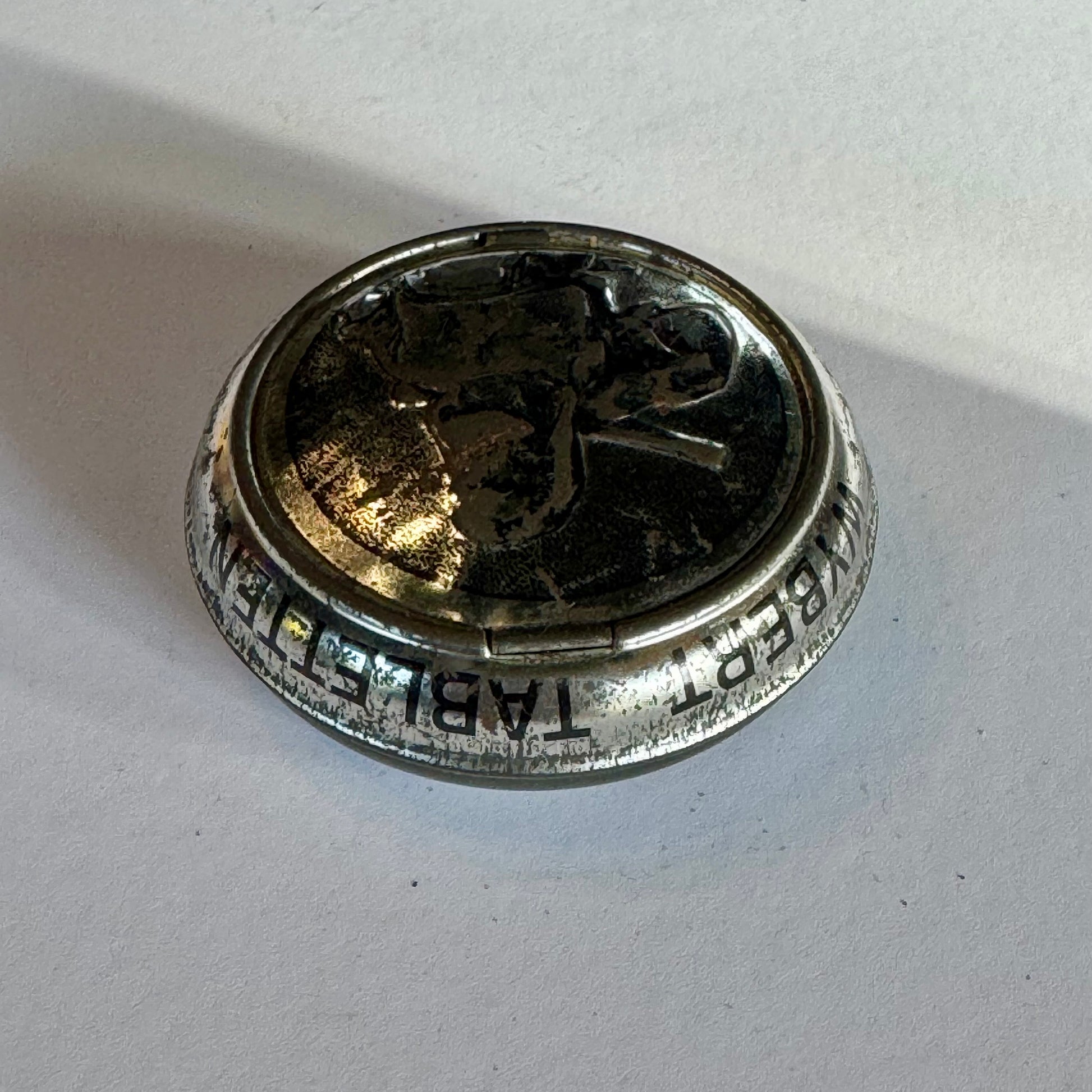 Zeldzaam metalen Wibert Tabletten-doosje, geproduceerd door Halter AG, Beinwil am See (Schweiz). Het ronde doosje heeft een reliëfafbeelding van een Zwitserse man met hoed en stok op het deksel, omgeven door de tekst “Wibert Tabletten – Halter AG Beinwil a. See – Schweiz”.