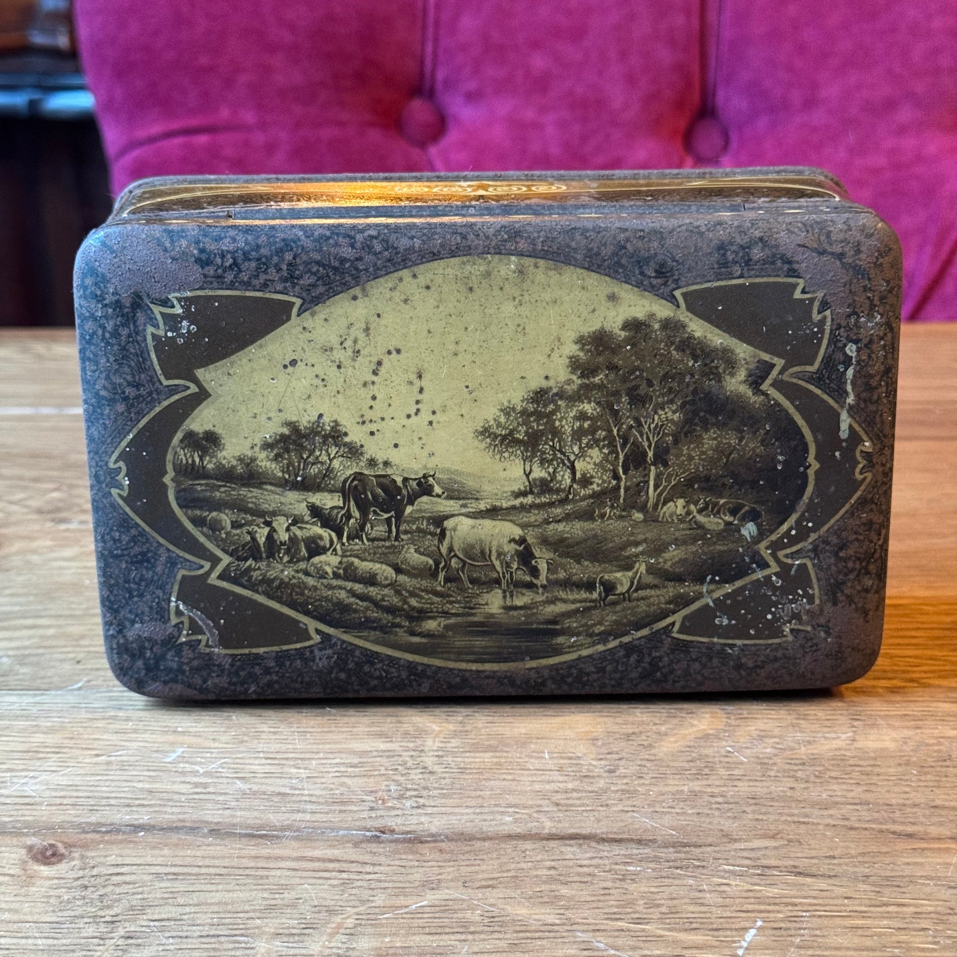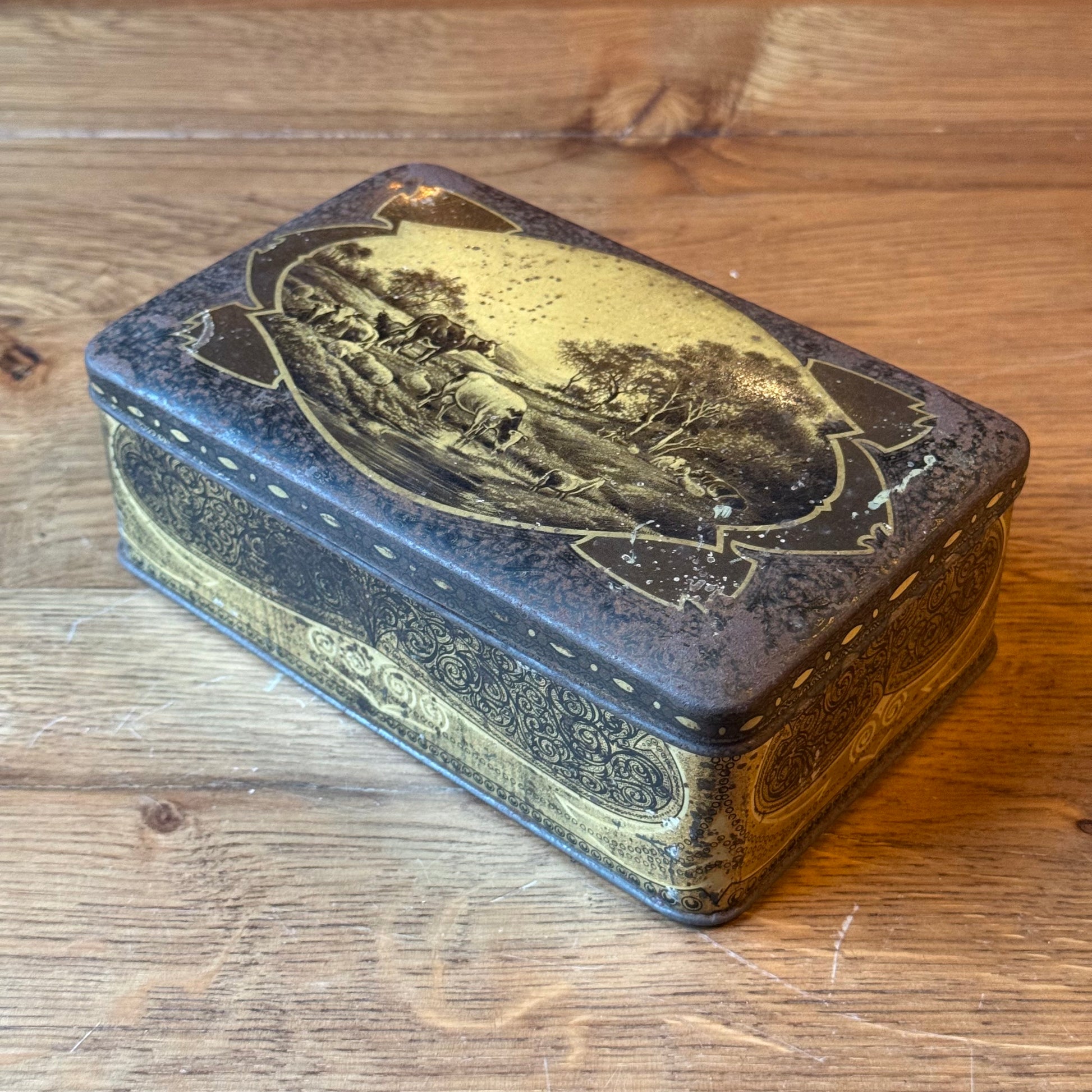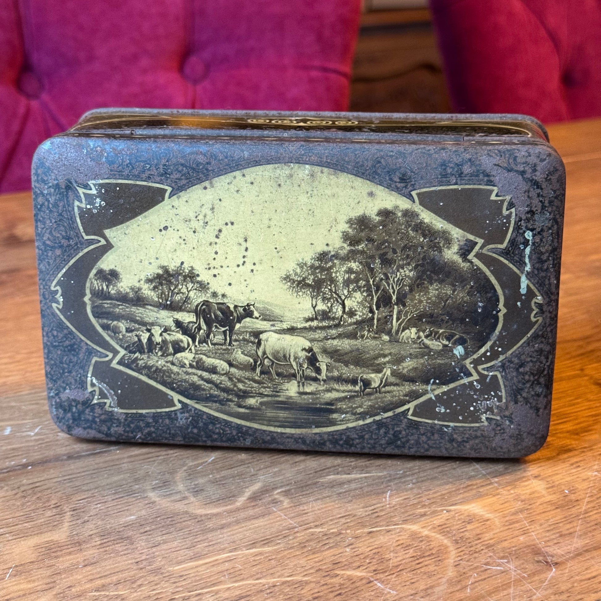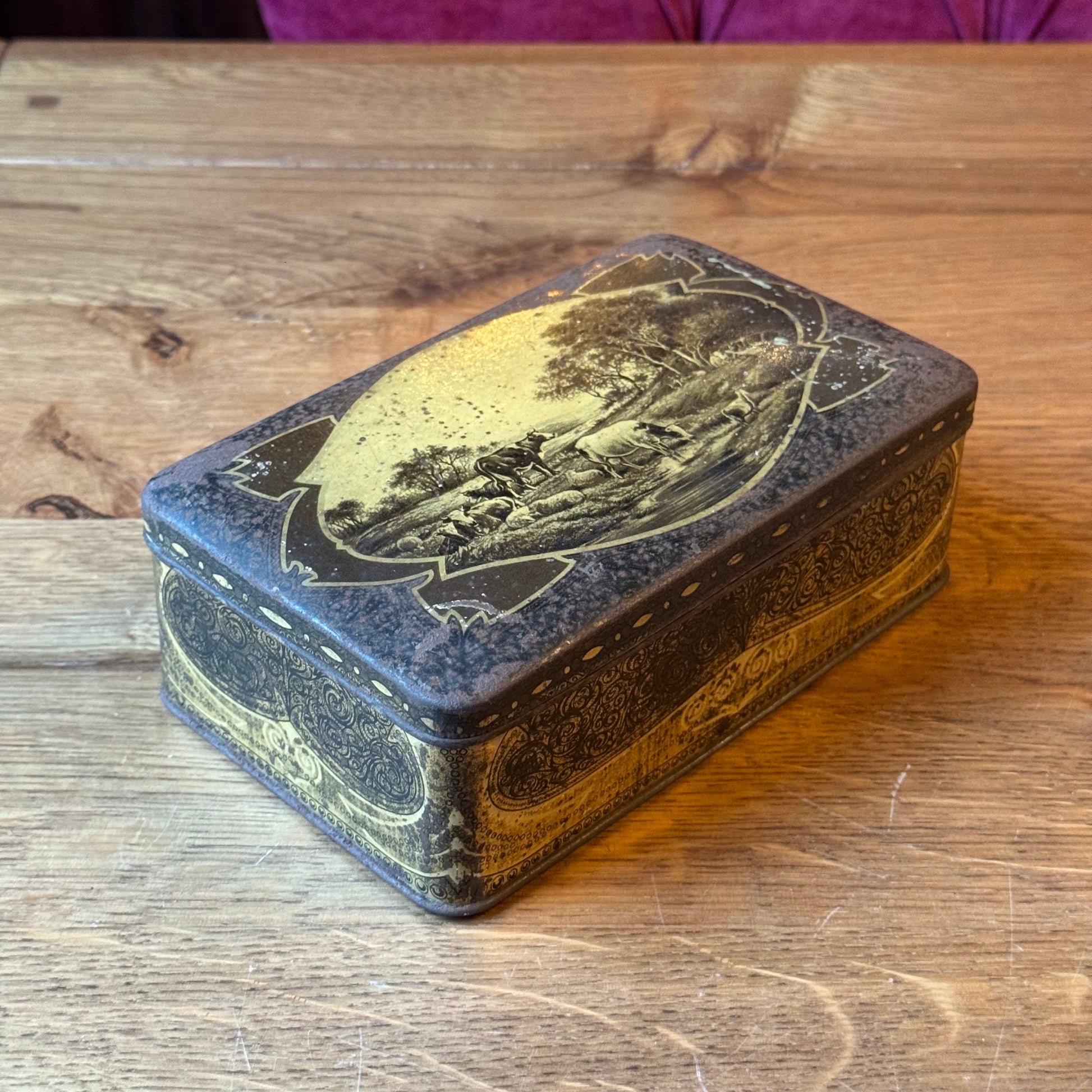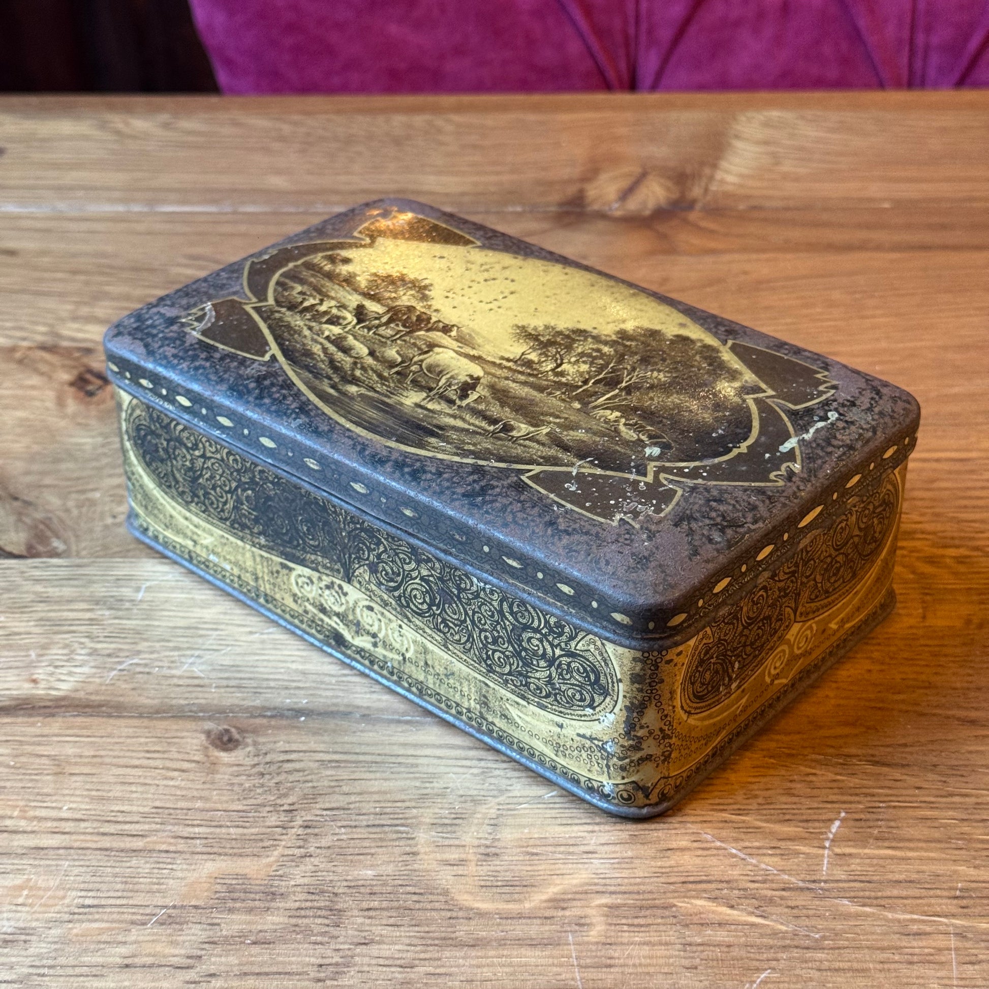 Antiek Jamin blik met landelijke scène – rechthoekig koekblik