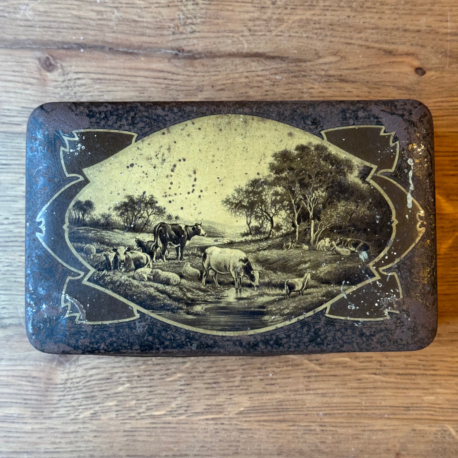 Rechthoekig metalen blik uitgegeven door Jamin, voorzien van een lithografische afbeelding met een landelijke scène met vee, bomen en waterpartij. De decoratie is uitgevoerd in sepia- en goudtinten binnen een sierlijk omlijst kader. De zijkanten zijn rondom voorzien van rijk gedetailleerde ornamentmotieven.