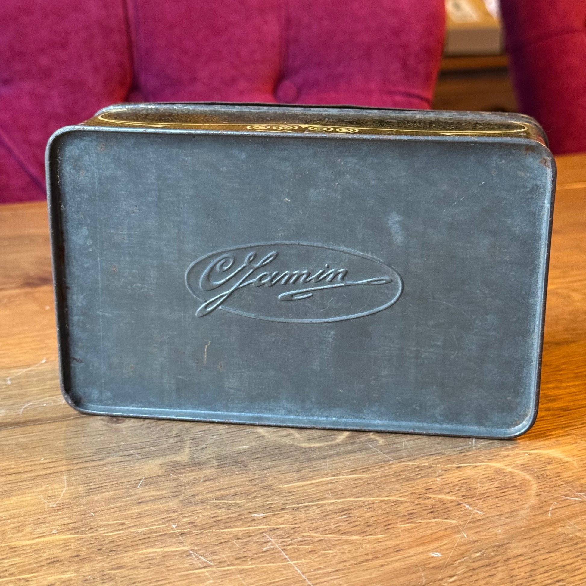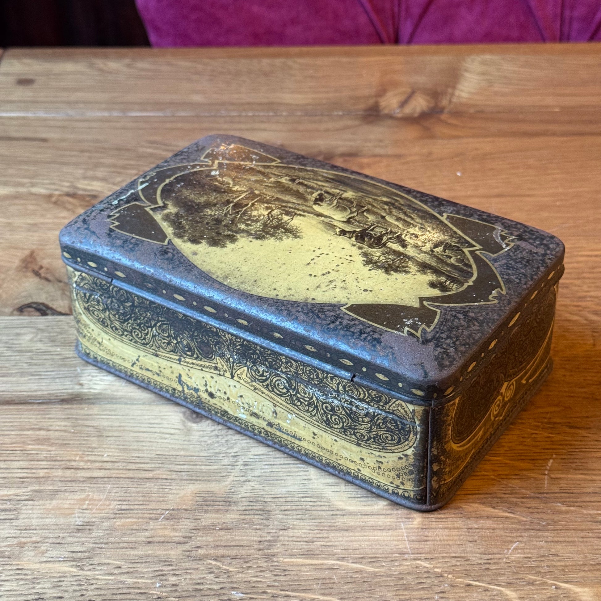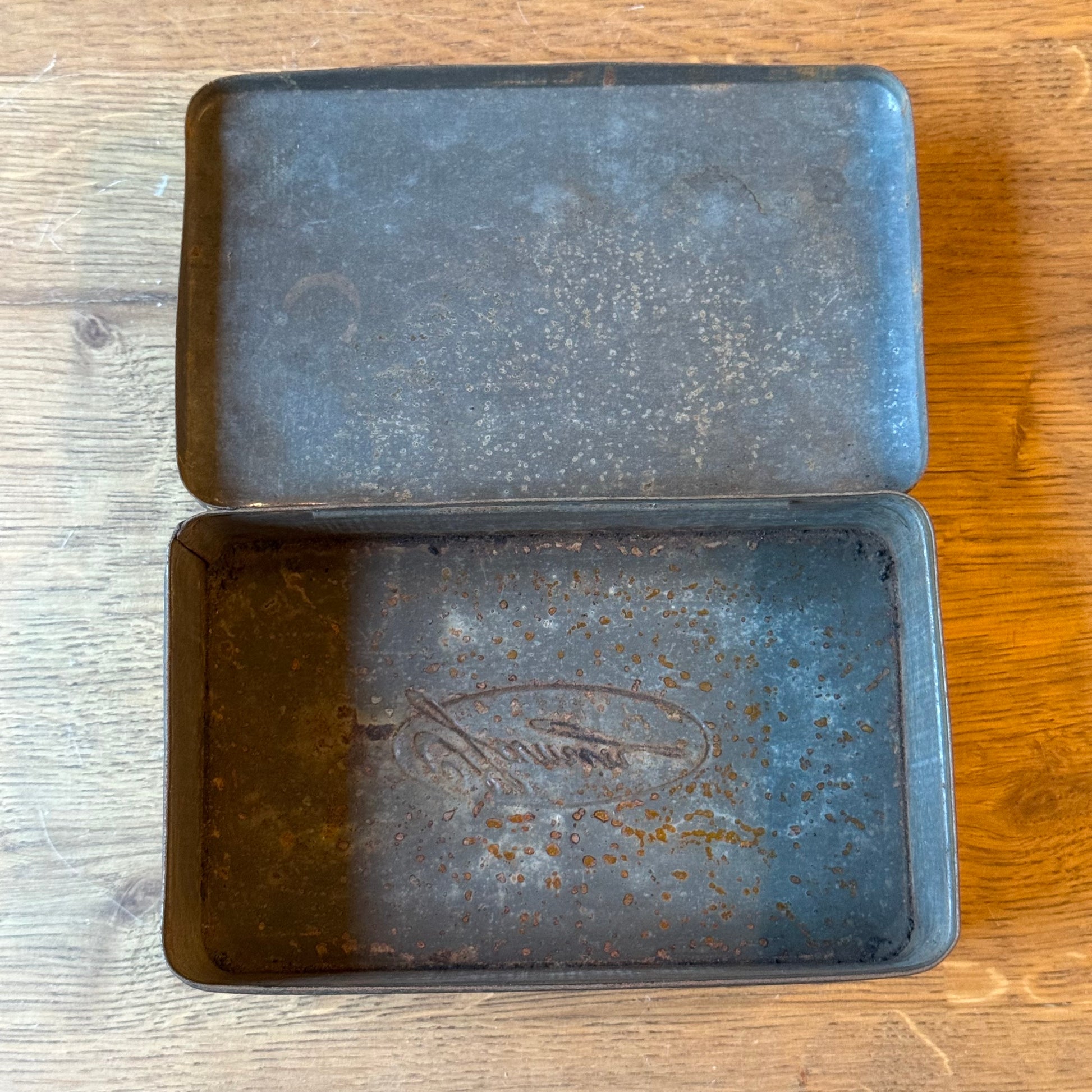 Het blik heeft afgeronde hoeken en een los deksel. De buitenzijde vertoont duidelijke gebruiks- en ouderdomssporen, waaronder slijtage van de decoratie, verlies van glans en kleine beschadigingen. De binnenzijde is ongecoat en toont oxidatie en roestvorming, passend bij leeftijd en oorspronkelijk gebruik.