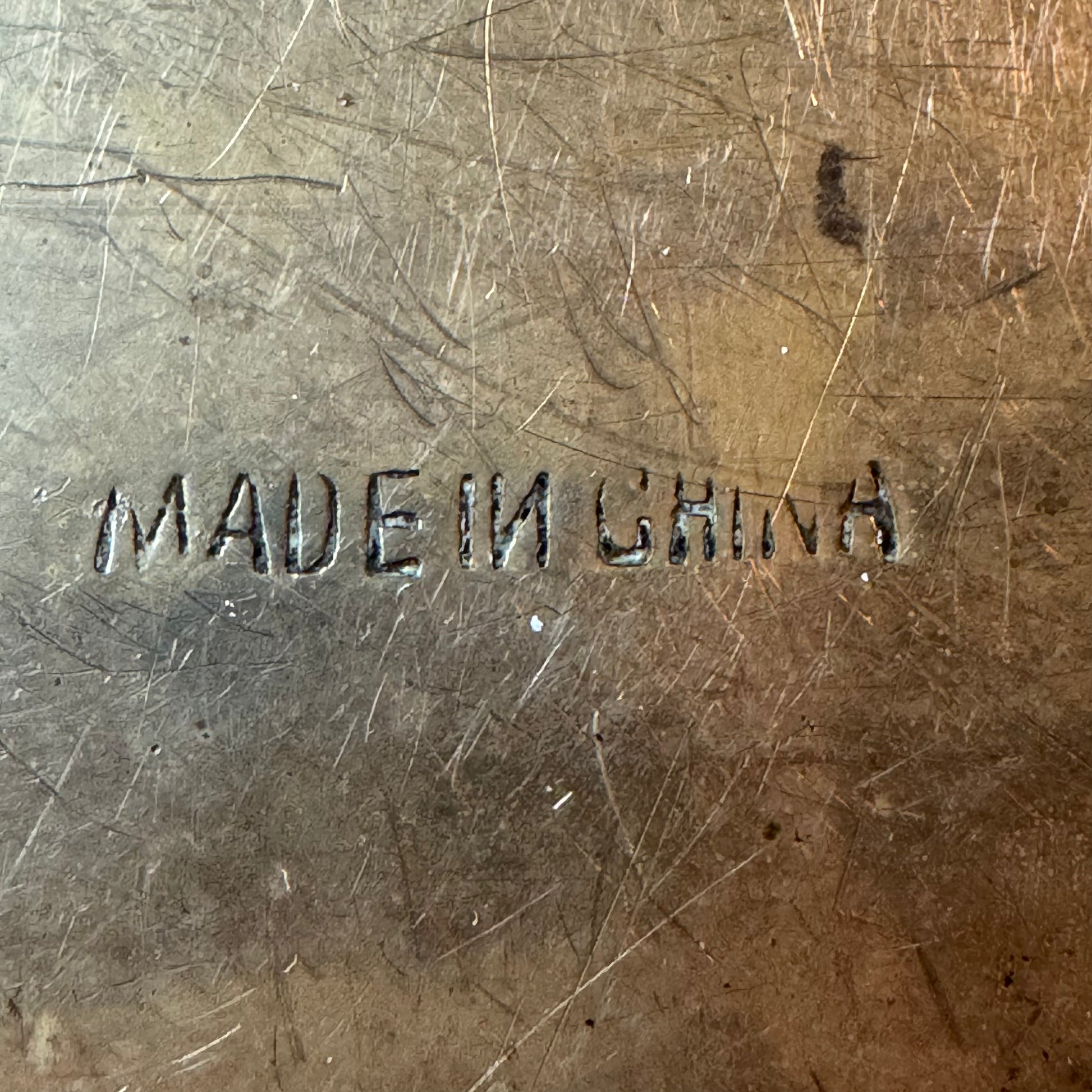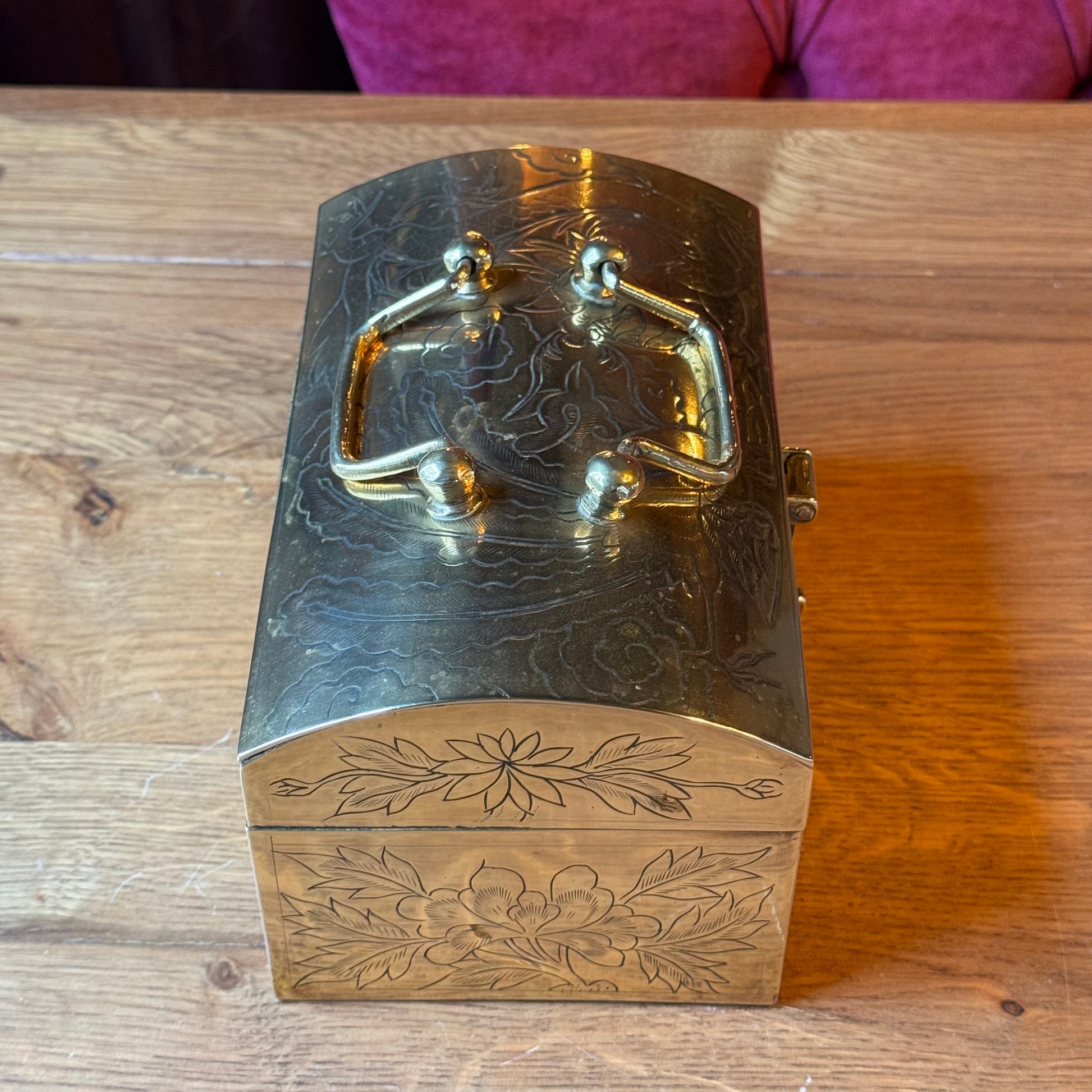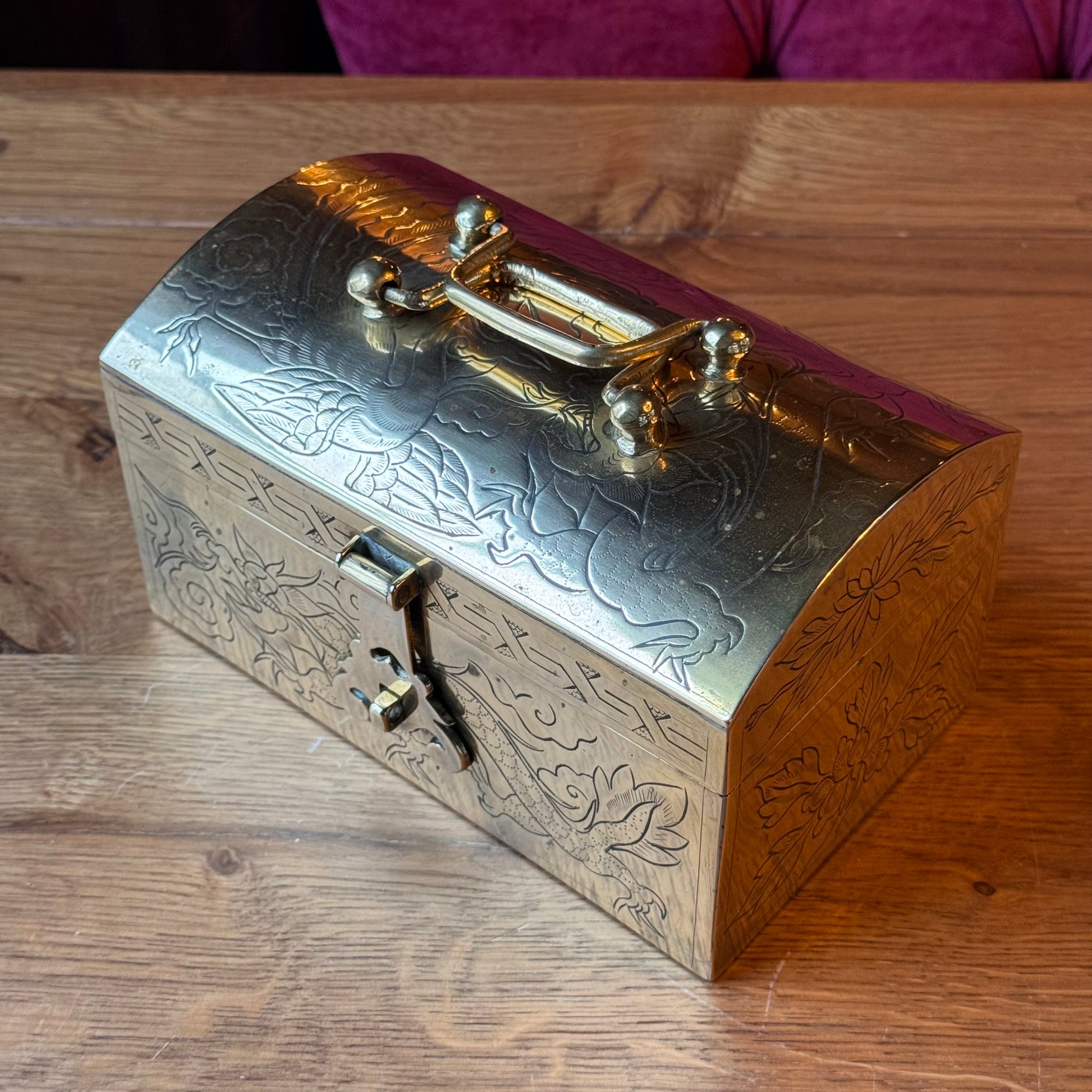 Antiek Chinees opbergkistje uitgevoerd in koper, met een gewelfd deksel en rondom gegraveerde decoratie. De buitenzijde is voorzien van traditionele Chinese motieven, waaronder een draak in wolken, florale ornamenten en geometrische randpatronen. De gravures zijn handmatig aangebracht en vertonen variatie in lijnvoering en diepte.