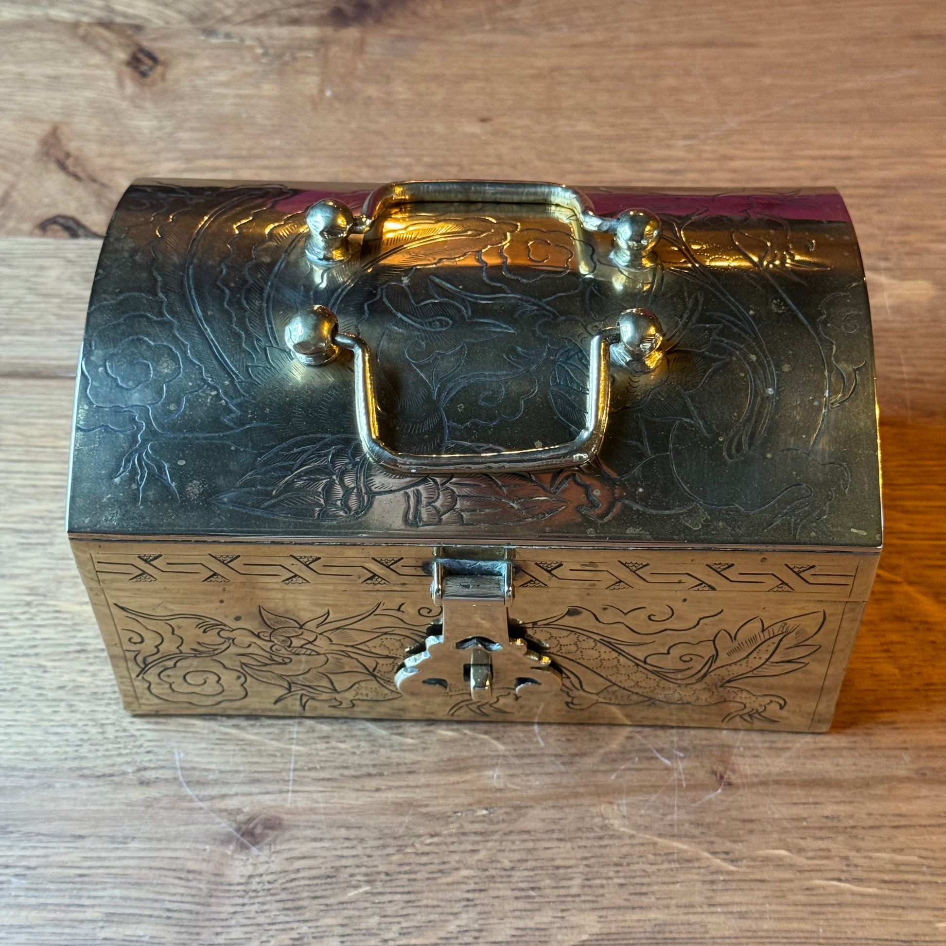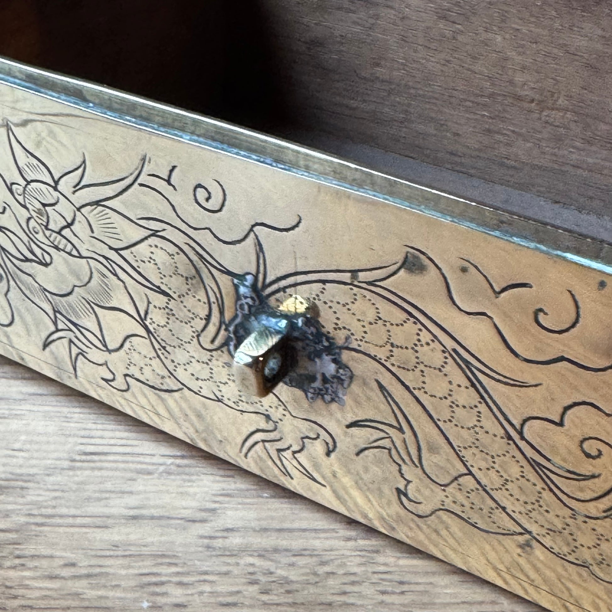Antiek Chinees koperen opbergkistje met gegraveerde draak
