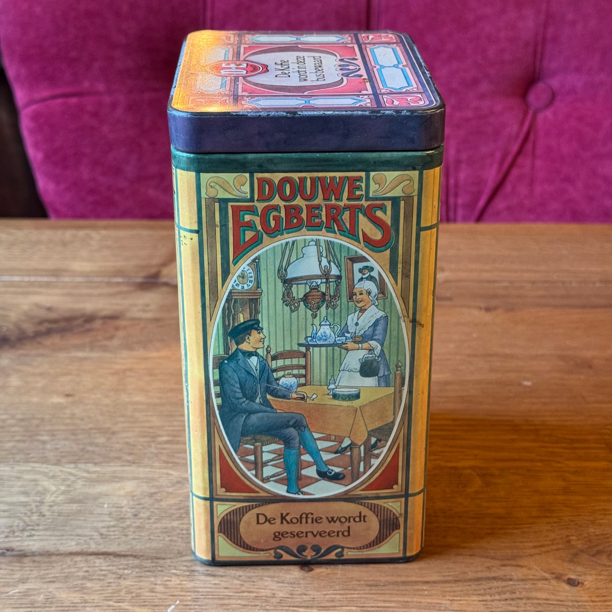 Rechthoekig metalen koffieblik van Douwe Egberts, uitgevoerd met rijk geïllustreerde voorstellingen van het traditionele koffieritueel. Elke zijde toont een andere scène, met bijschriften zoals De koffie wordt gezet, geserveerd en gedronken. Het blik heeft een los deksel en is voorzien van originele bedrukking rondom.