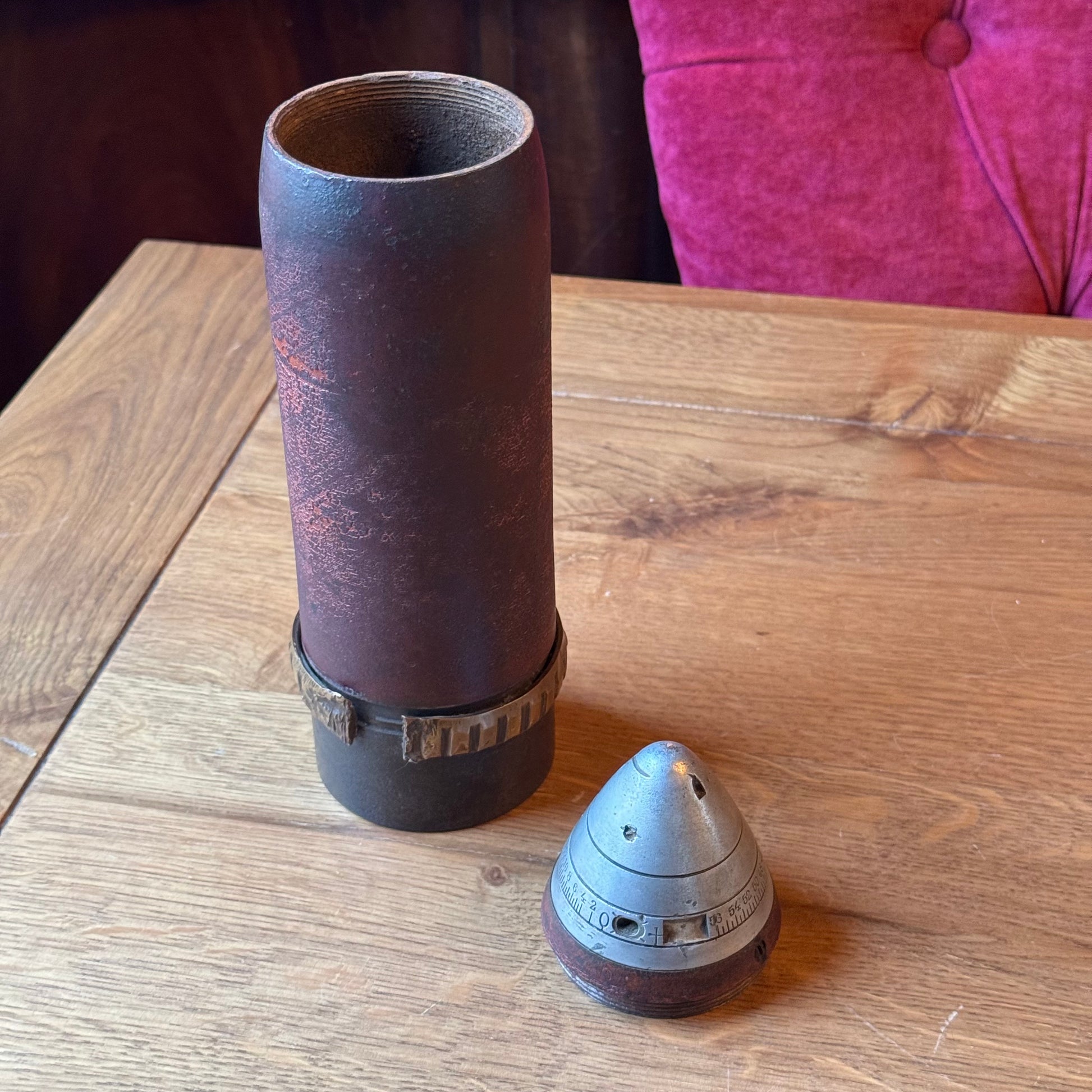 Zwaar metalen object met projectielvormige basis en een los zittend bovenelement. De vorm, verhoudingen en constructie vertonen overeenkomsten met historische munitie- of artilleriegerelateerde objecten uit het begin van de 20e eeuw, zonder dat een exacte herkomst of militaire toepassing kan worden bevestigd.