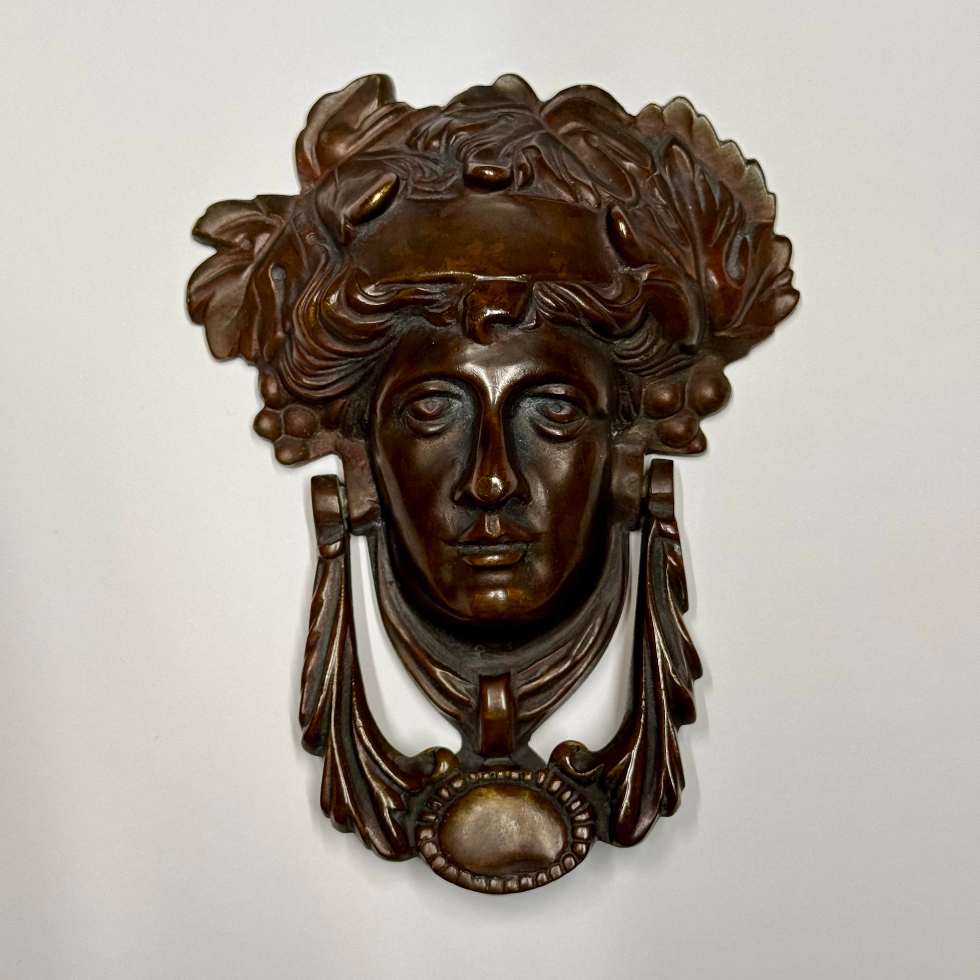 Zeer fraaie antieke deurklopper van massief brons, afkomstig van een Frans kasteel. Het gezicht van een Bacchante, een volgelinge van de wijngod Bacchus, is verfijnd uitgewerkt met druivenranken en bladeren in haar haar. Een zeldzaam stuk gietkunst uit de late 19e eeuw, symbool van bescherming, overvloed en elegantie.