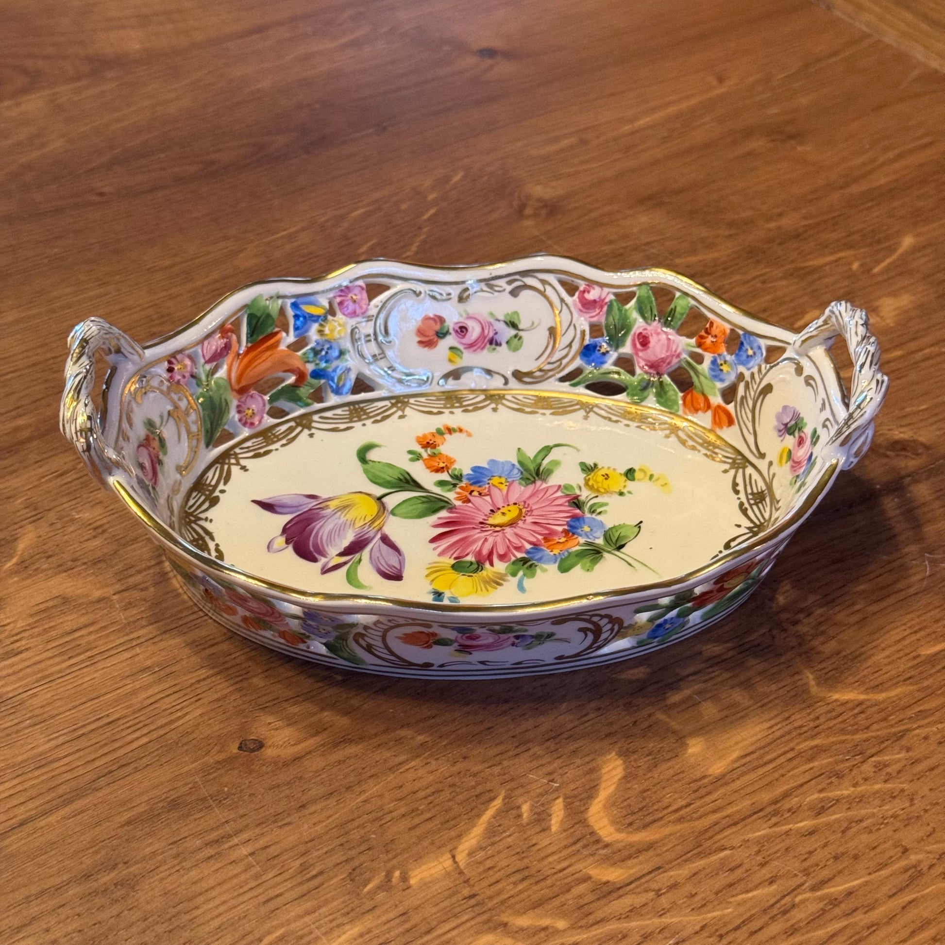 Een verfijnde en klassieke schaal uit de Dresden-porseleintraditie, uitgevoerd met opengewerkte randen, kleurrijke bloemmotieven en vergulde accenten. Deze stukken werden volledig met de hand beschilderd, wat elk exemplaar uniek maakt. Door de levendige kleuren en het filigraan snijwerk is dit een typische decoratieve schaal zoals Dresden die sinds de 19e eeuw produceert, elegant, sierlijk en ambachtelijk.