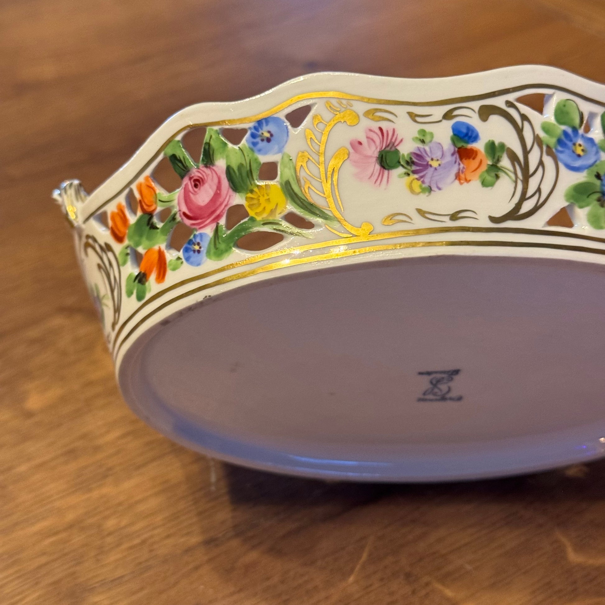 Handbeschilderde Dresden porseleinen schaal met opengewerkt ajour en rijk bloemdecor, 17 cm