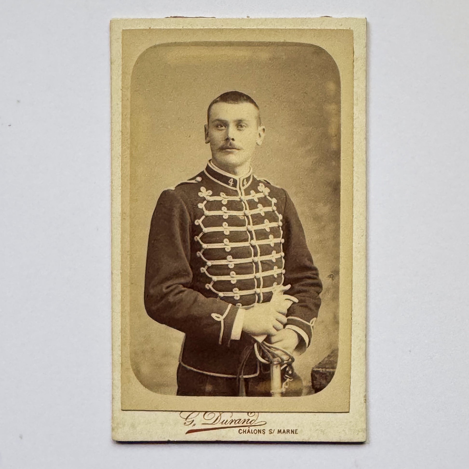 Een indrukwekkend Frans carte de visite-portret van een militair in rijk gedecoreerd uniform, gefotografeerd rond 1880 door G. Durand, gevestigd aan de Rue des Trésoriers 2 & Rue de Vaux 36, Châlons-sur-Marne.