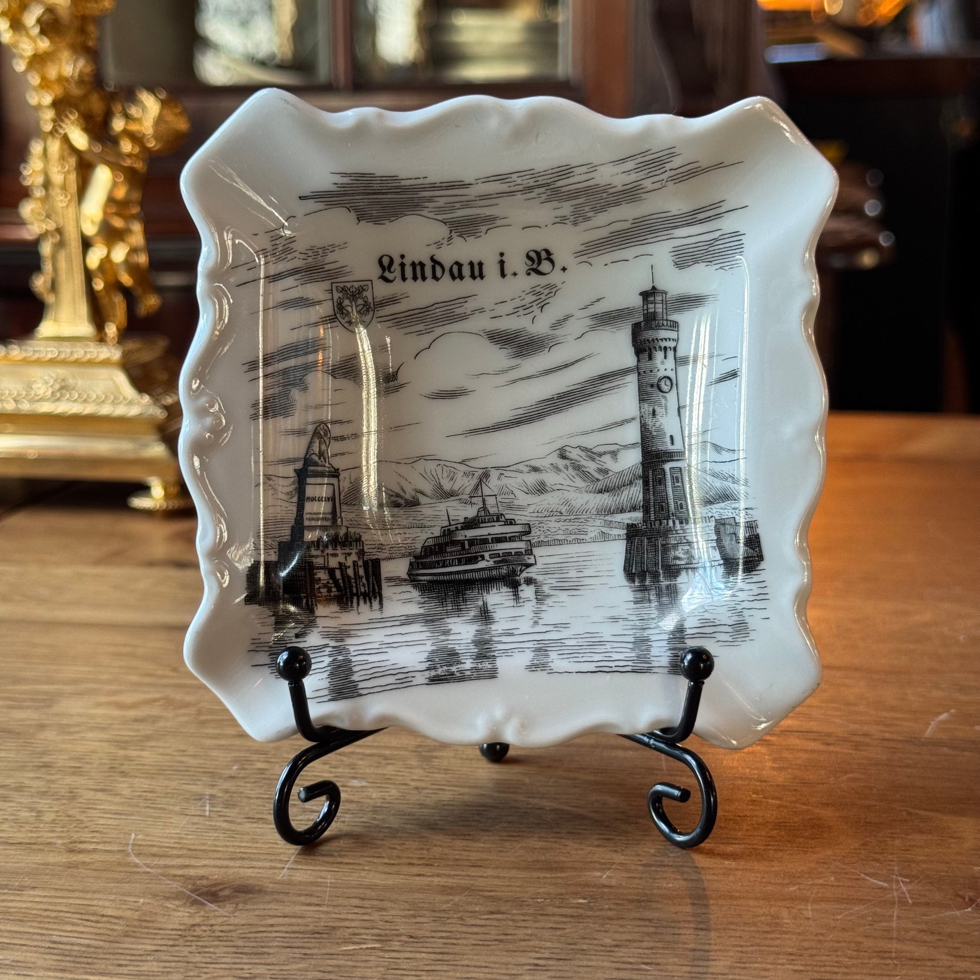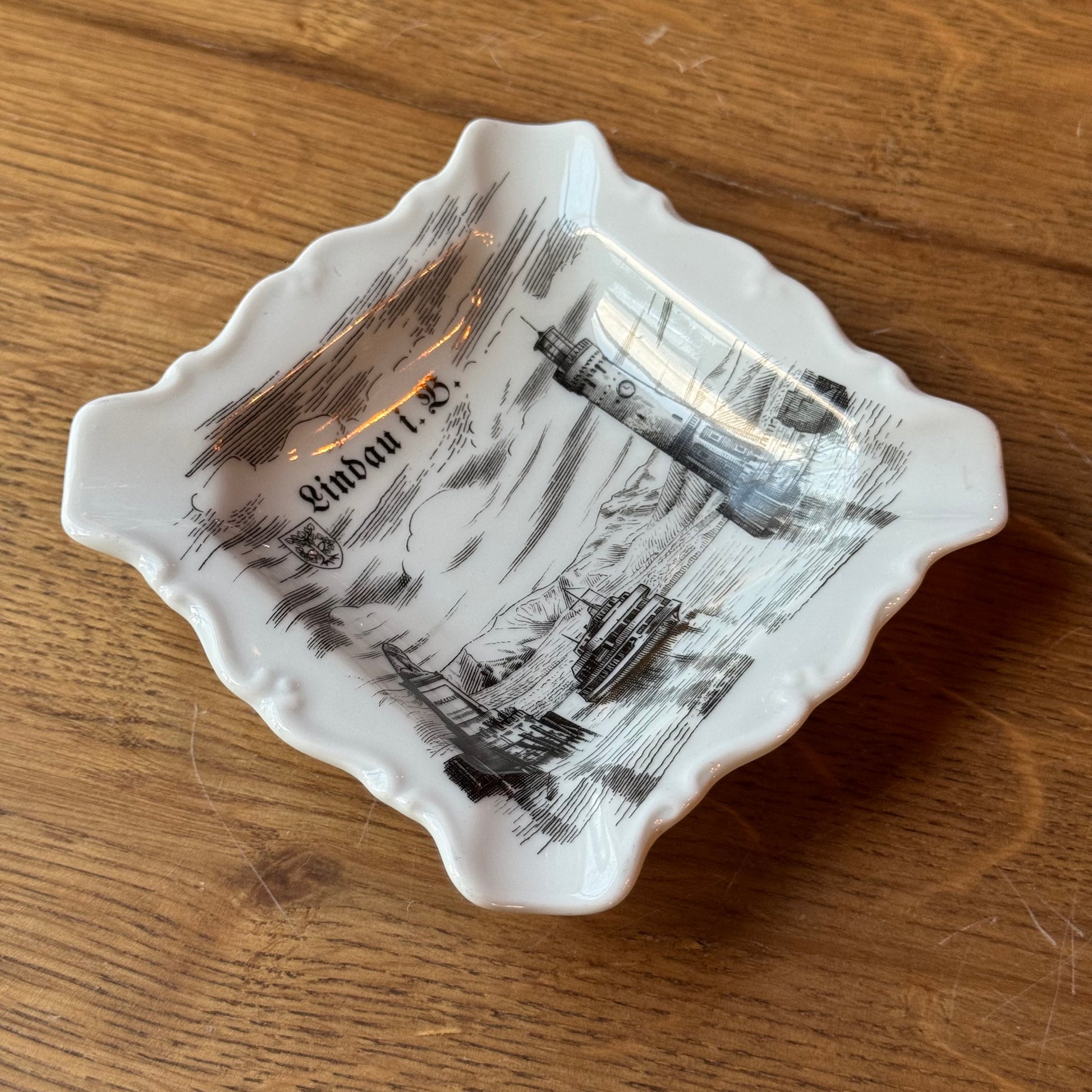 Charmant vintage porseleinen asbakje met een gedetailleerde zwart-wit tekening van de beroemde haven van Lindau am Bodensee, compleet met de iconische vuurtoren en de Beierse leeuw.