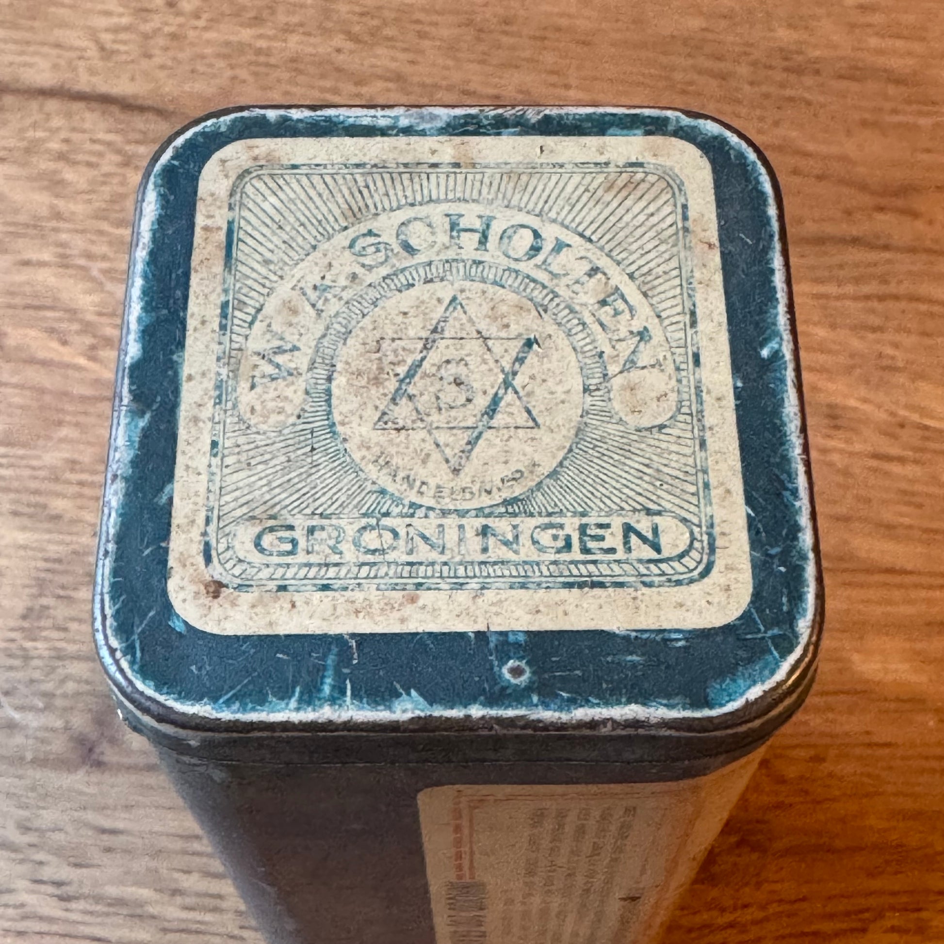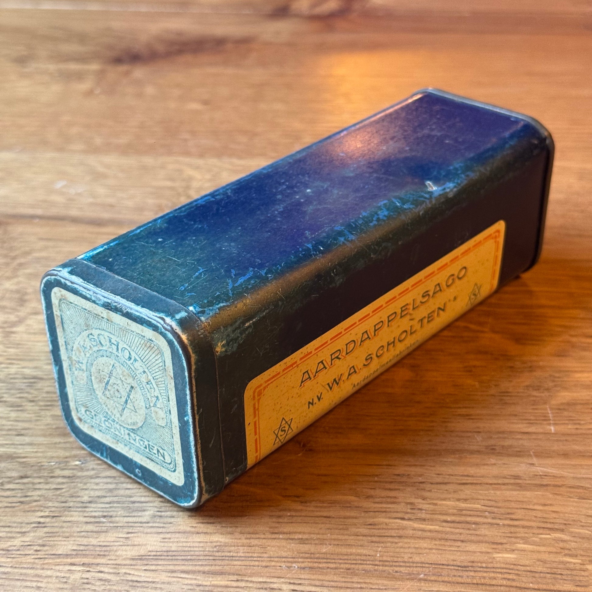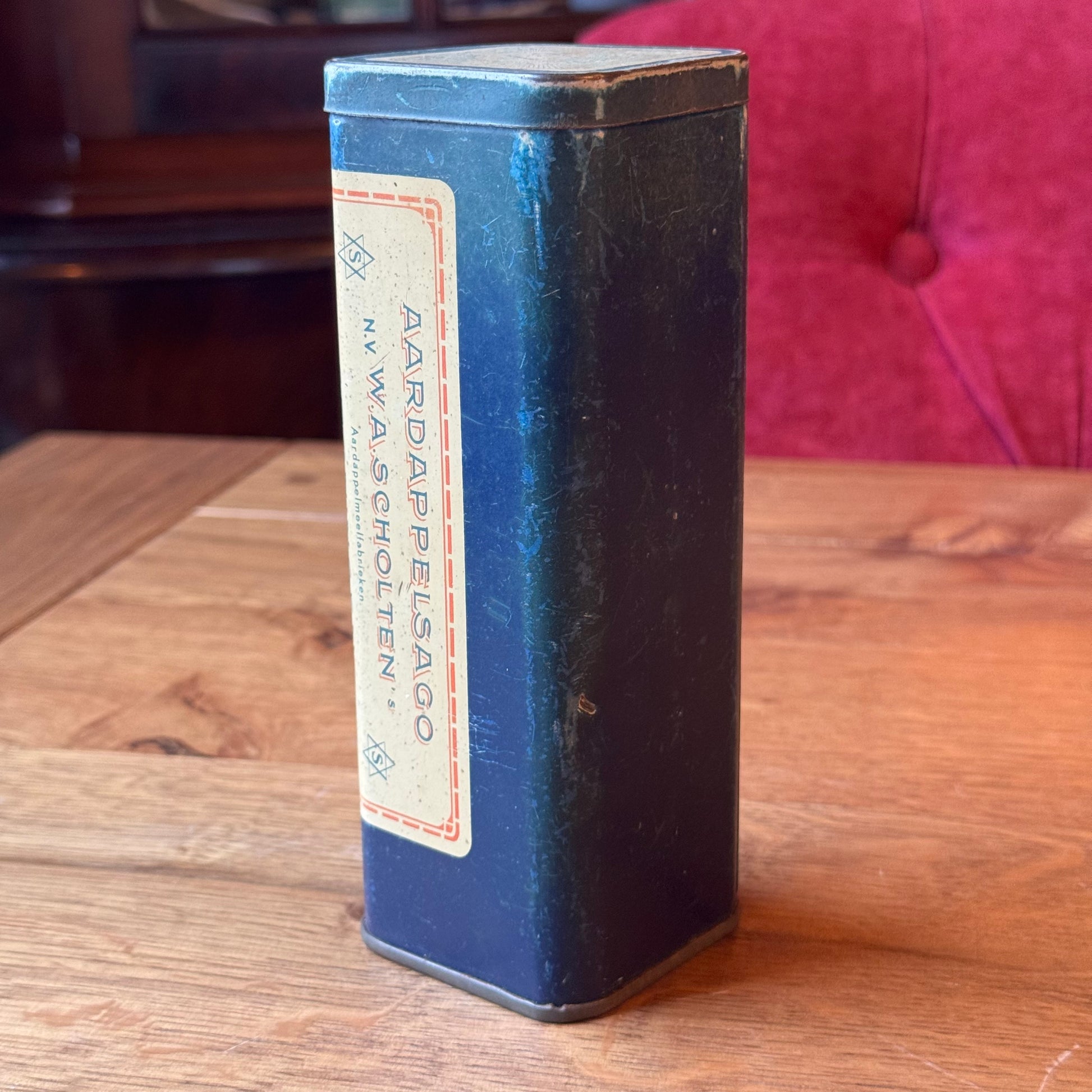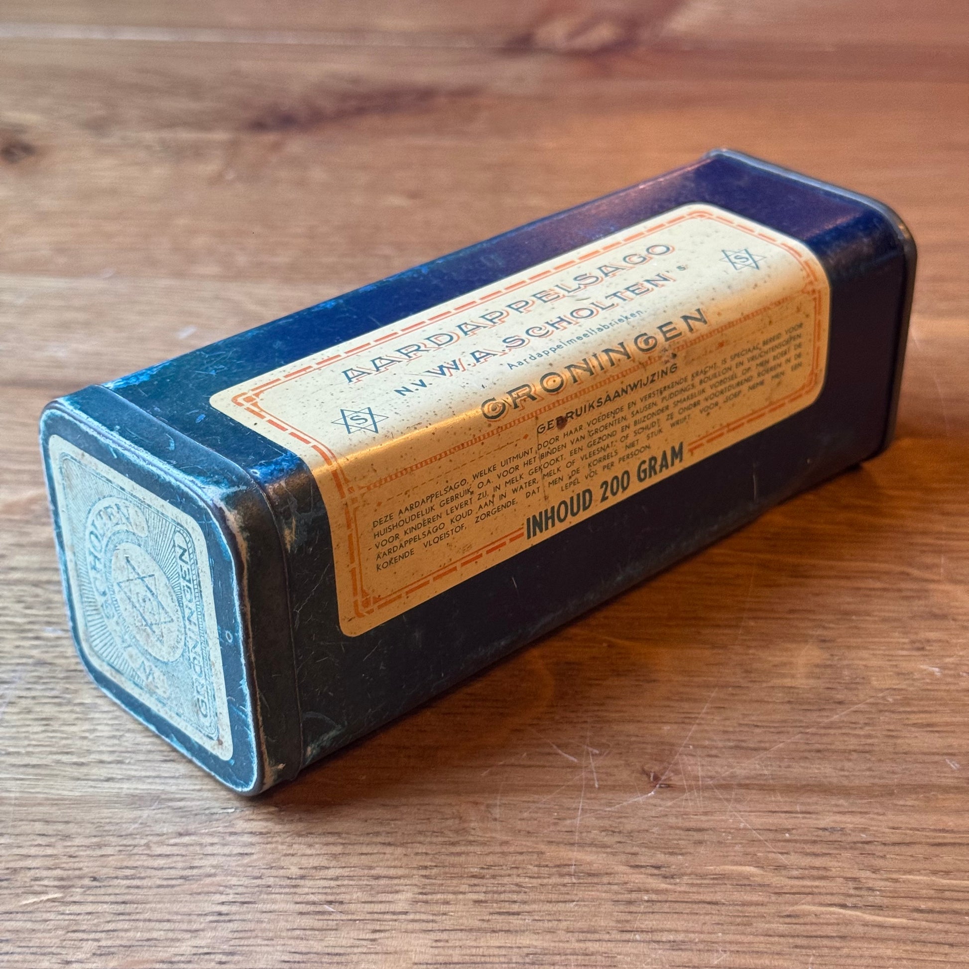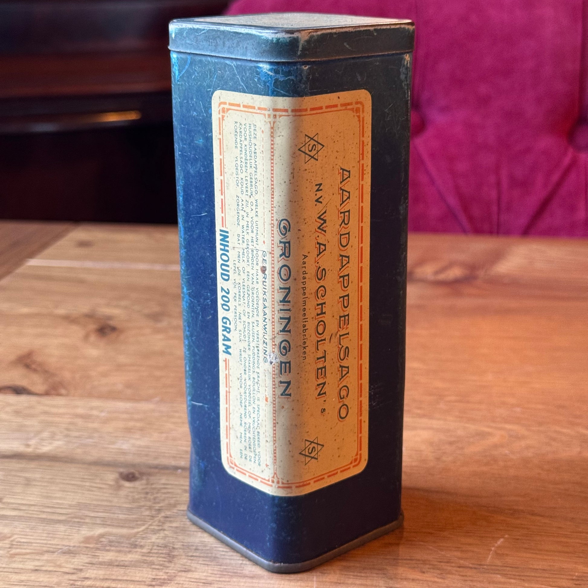 Haal een authentiek stukje Nederlandse geschiedenis in huis met dit oude voorraadblik van N.V. W.A. Scholten's Aardappelmeelfabrieken uit Groningen. Het blik, uitgevoerd in een diepblauwe kleur, bevat nog het originele crèmekleurige etiket.