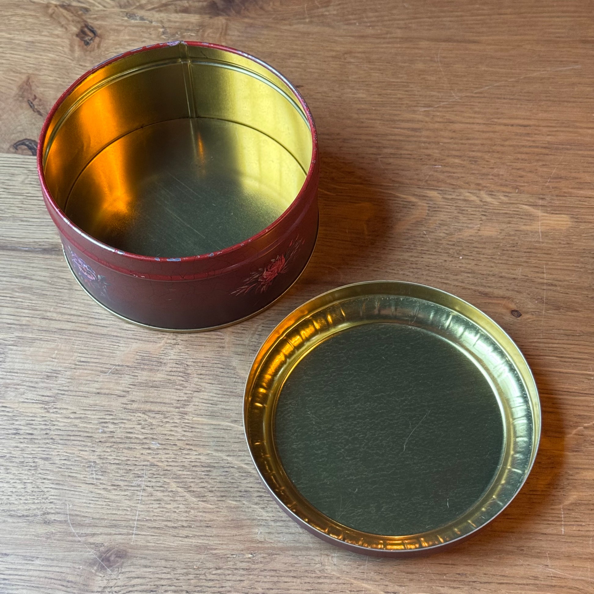 De binnenzijde is goudkleurig, wat een luxe contrast geeft bij het openen. Oorspronkelijk waarschijnlijk gebruikt voor luxe bonbons of koekjes, maar door het tijdloze ontwerp nu perfect als sieradendoosje, naaiblikje of sfeervolle opberger op een dressoir.