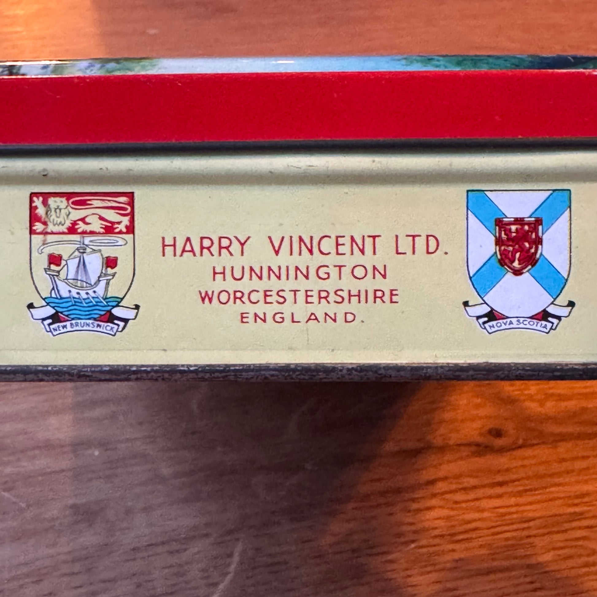 Rechthoekig lithografisch toffeeblik van Harry Vincent Ltd., Hunnington (Worcestershire, England), vervaardigd voor de Canadese markt. Het deksel toont een meerkleurige afbeelding van Parliament Hill, Ottawa, met centraal de Peace Tower en een inzetportret van een Royal Canadian Mounted Police-ruiter. De zijkanten zijn uitgevoerd in lichtgeel en voorzien van provinciewapens en de opslogan “Take the Home Sweet Home”.