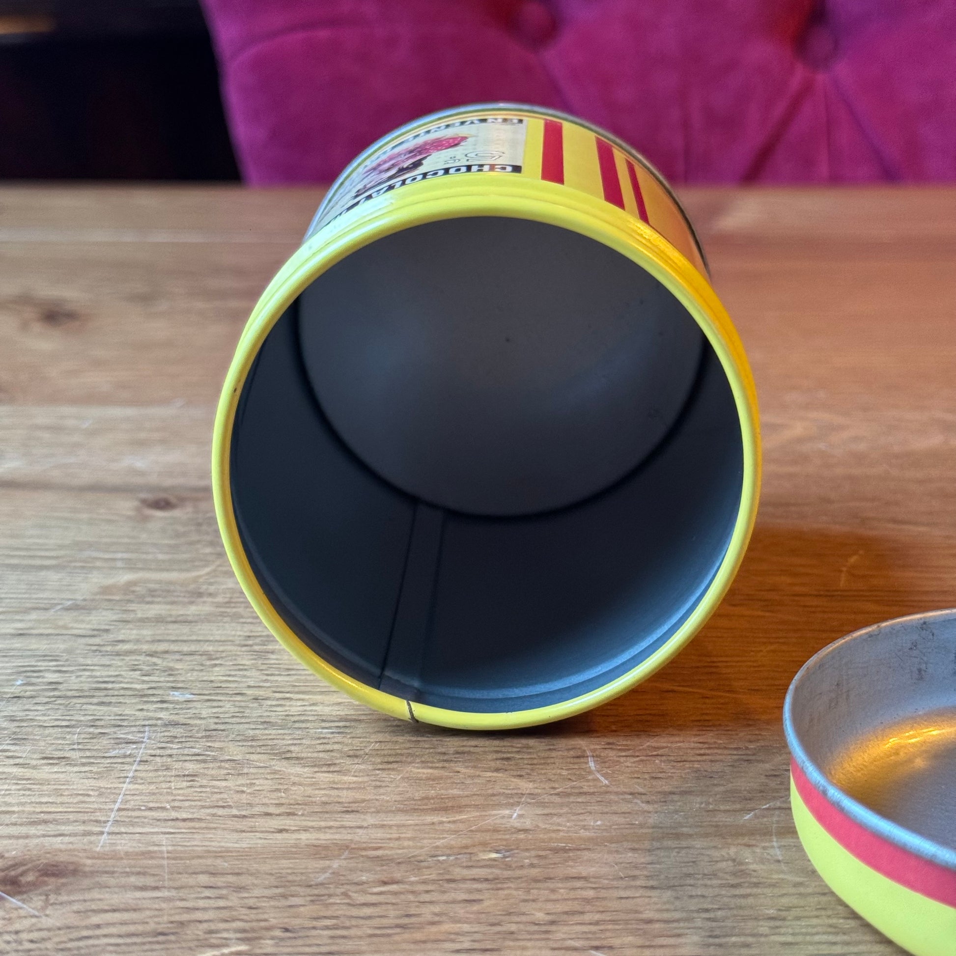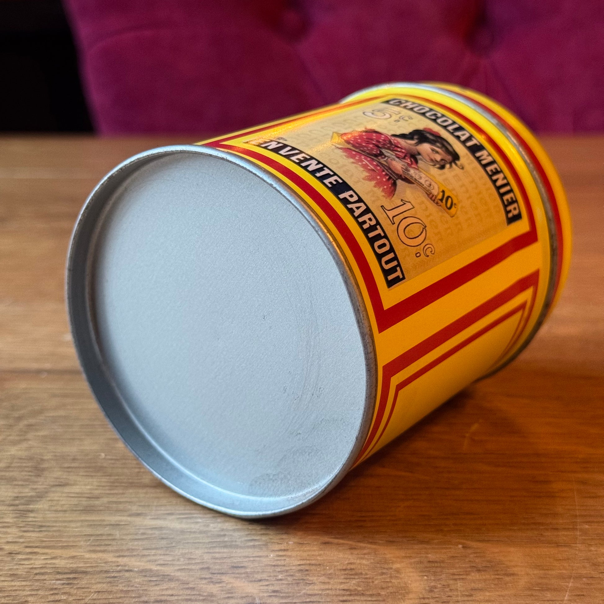 Breng een stukje Franse nostalgie in huis met dit vrolijke, gele voorraadblik van Chocolat Menier. Op het blik staat de wereldberoemde afbeelding van het kleine meisje dat met een stuk chocolade de merknaam op de muur schrijft. Dit ontwerp van Firmin Bouisset uit 1893 wordt gezien als een van de eerste voorbeelden waarbij een kind in reclame-uitingen werd gebruikt.