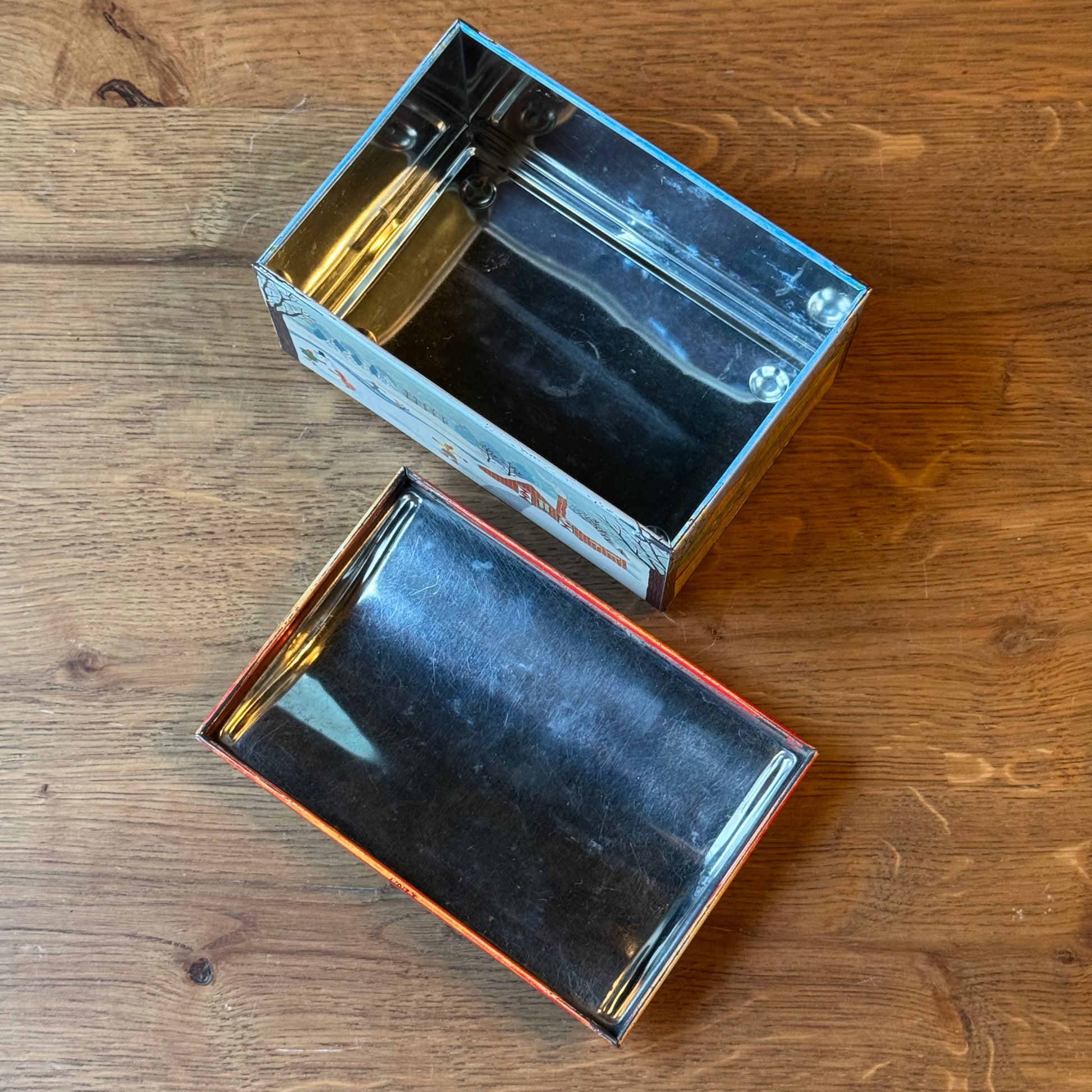De buitenzijde toont gedetailleerde scènes met boerderijen, bomen, akkers en spelende figuren in winter- en zomertafereel. Het interieur is uitgevoerd in blank metaal. Binnenin en op de bodem zijn normale gebruikssporen zichtbaar, waaronder lichte krassen en slijtage passend bij leeftijd en gebruik. Het blik sluit goed en is constructief intact.