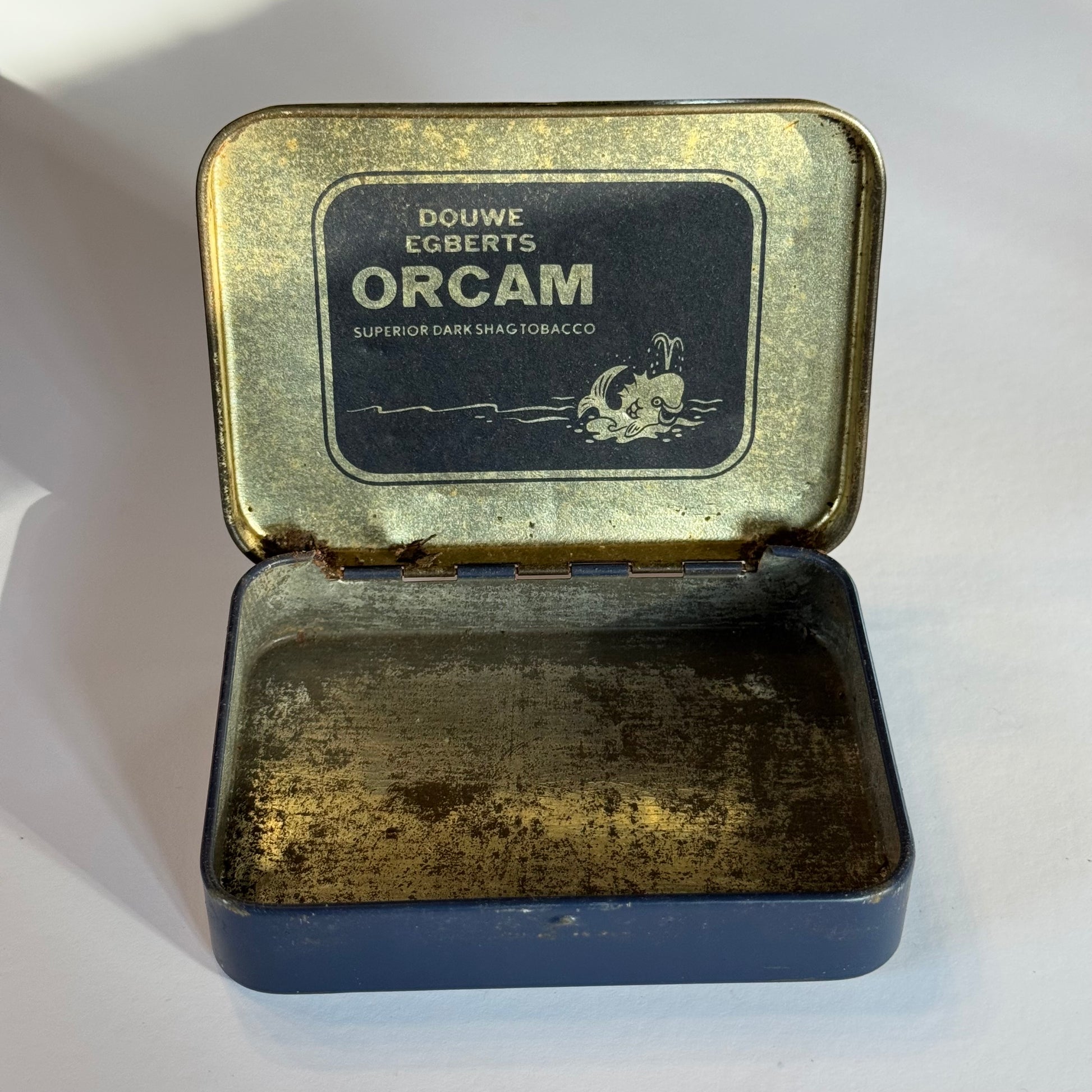 Zeldzaam Douwe Egberts Orcam-tabaksblik uit de jaren 1950, gemaakt voor de “Superior Dark Shag Tobacco”. Het blik toont een charmante illustratie van een speelse orka-achtige vis in blauw en goudtinten, typisch voor het vrolijke mid-century ontwerp van Douwe Egberts.