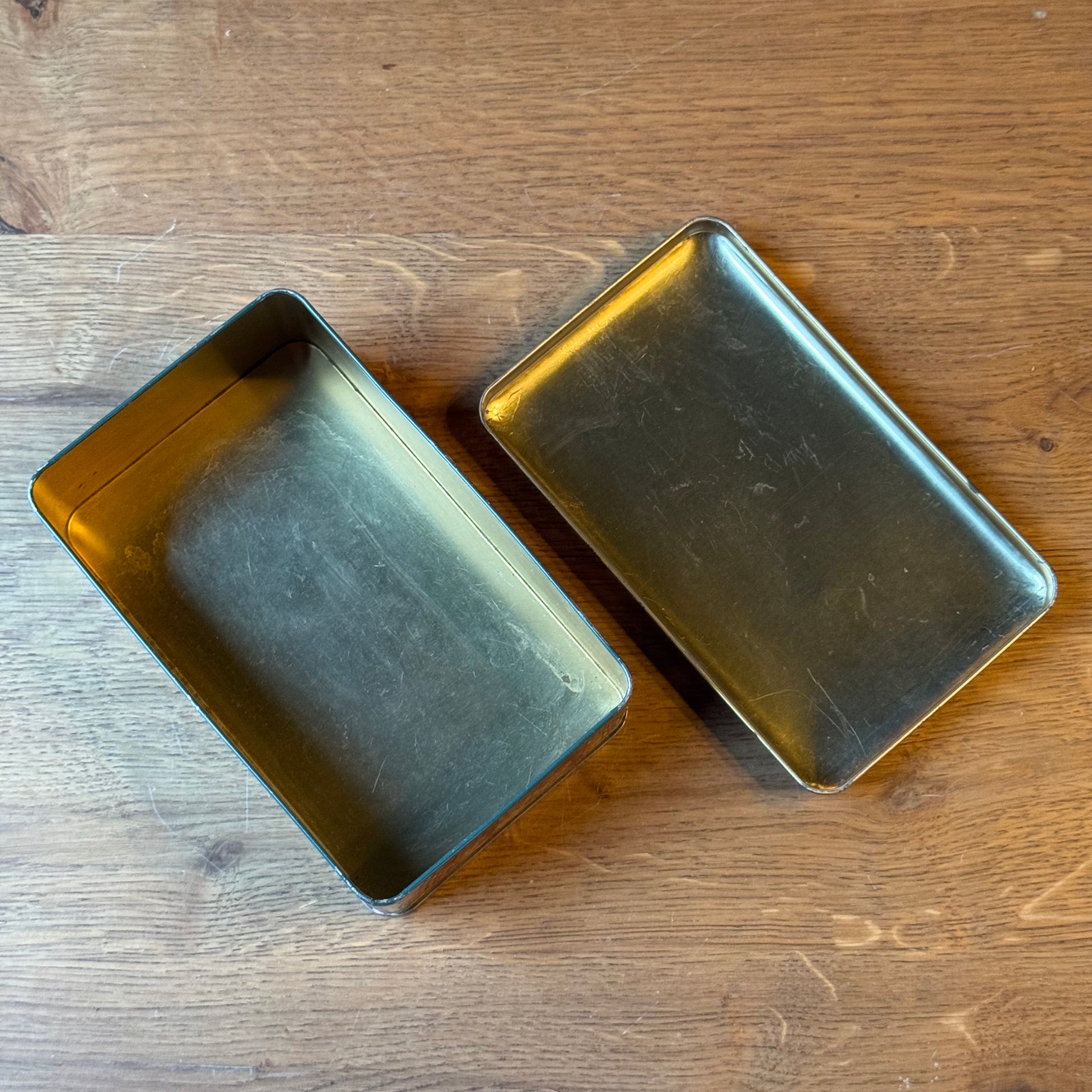Het blik is afgewerkt met beschilderde en gelakte oppervlakken. De binnenzijde is ongecoat met gebruikssporen passend bij leeftijd en gebruik.
