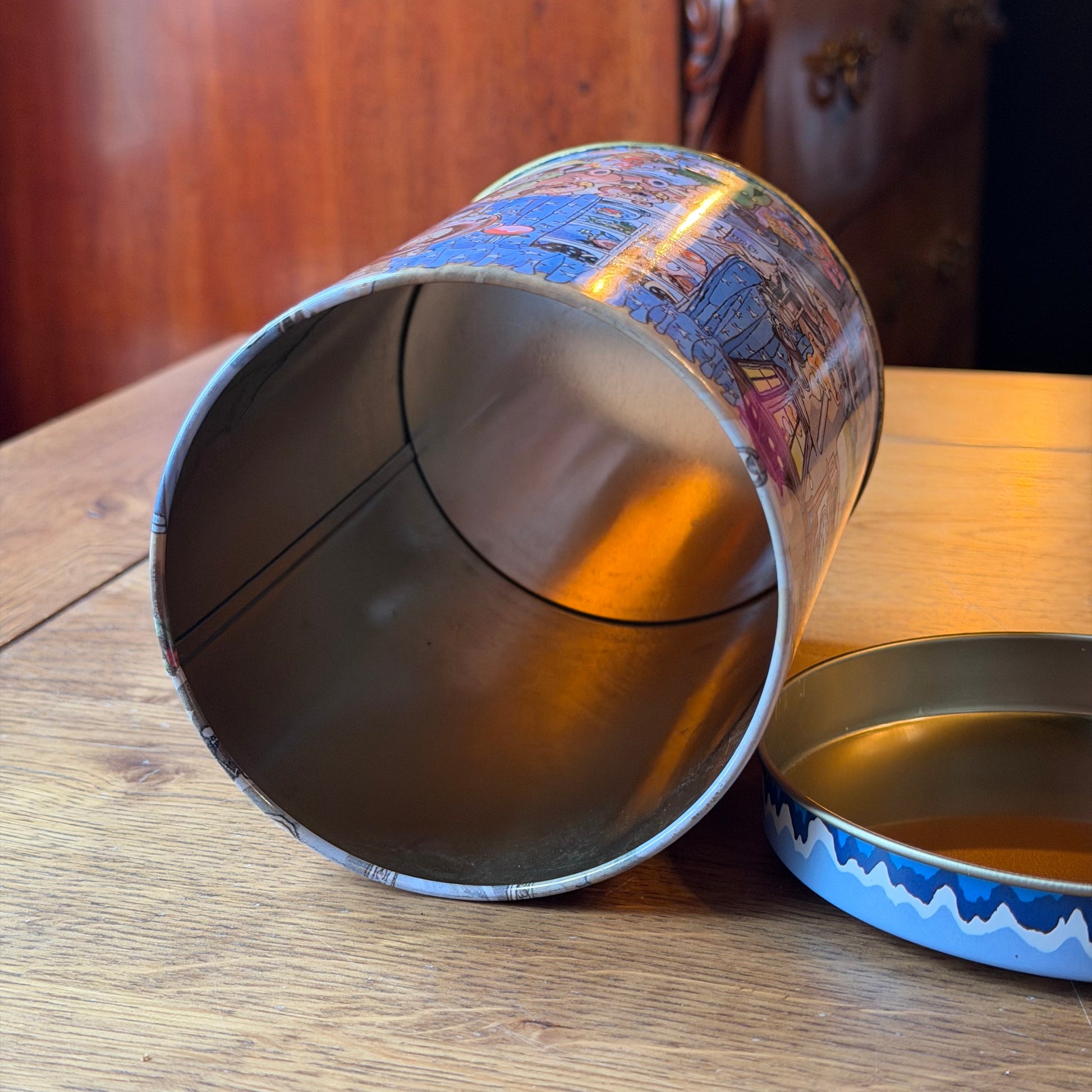 Dit cilindervormige kerstblik is rondom voorzien van een gedetailleerde, kleurrijke winterillustratie met speelse figuren, speelgoed en een huiselijke kerstsfeer. Het tafereel loopt door over het gehele blik en nodigt uit om steeds nieuwe details te ontdekken, wat het een typisch decoratief seizoensobject maakt.