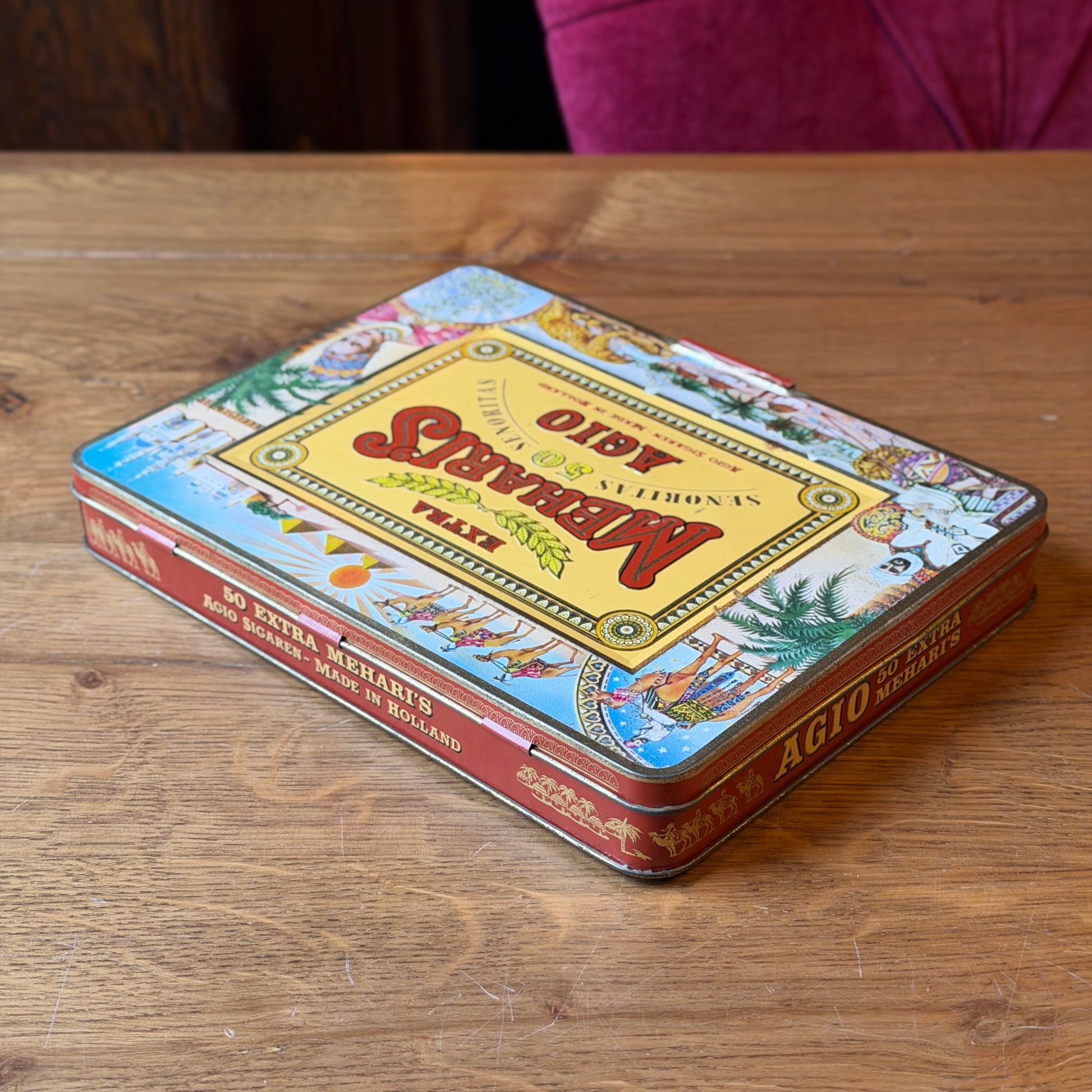 Rechthoekig vintage sigarenblik van AGIO, uitgevoerd in meerkleurige lithografische druk. Het blik is voorzien van een rijk gedecoreerd ontwerp met woestijn- en oriëntaalse motieven, waaronder kamelen, palmbomen, architectuur en figuren in traditionele kleding. In het midden de merkvermelding Mehari’s met aanduiding Extra – 50 Senoritas.